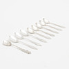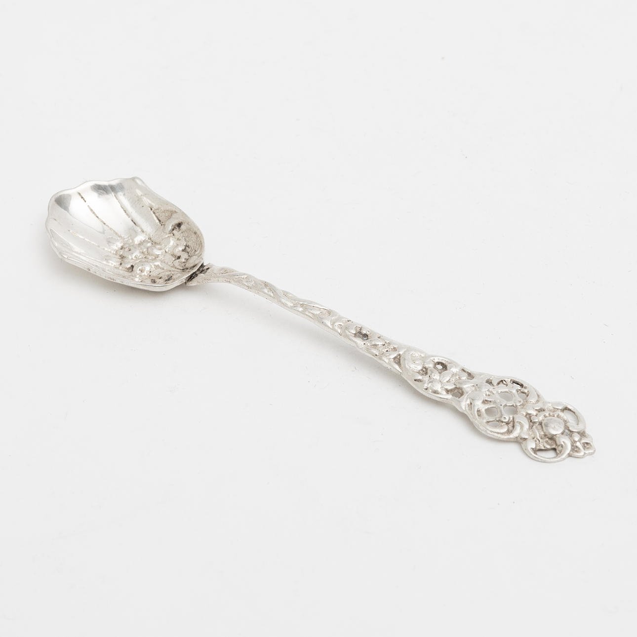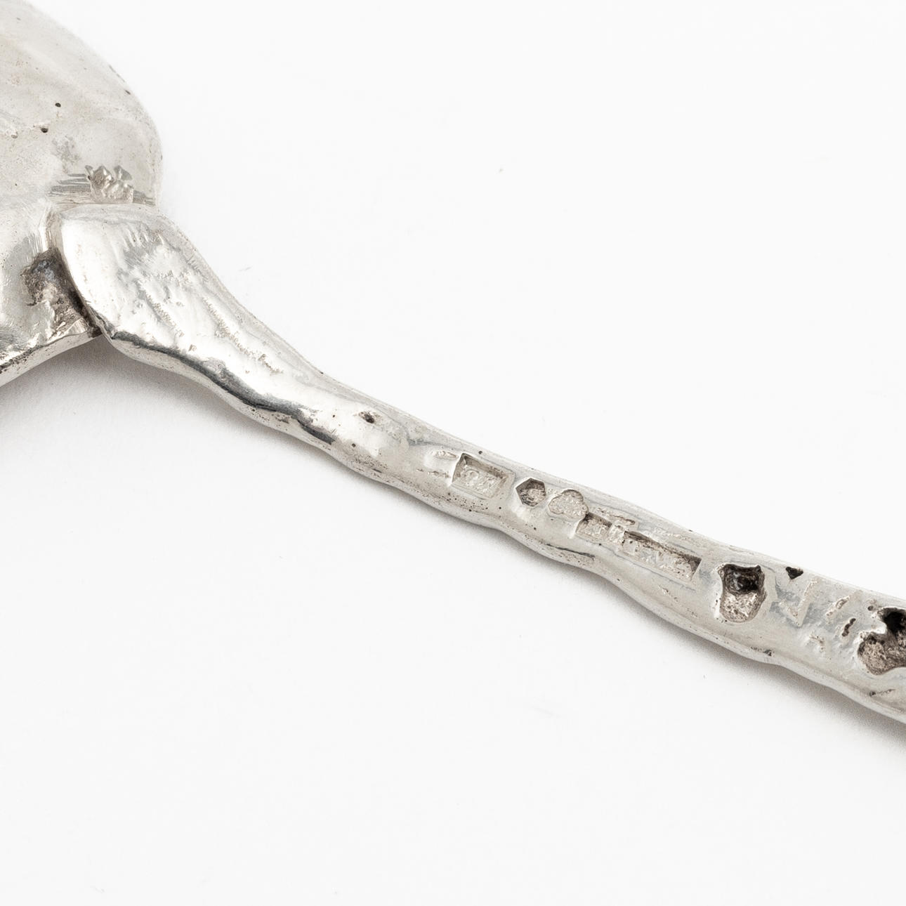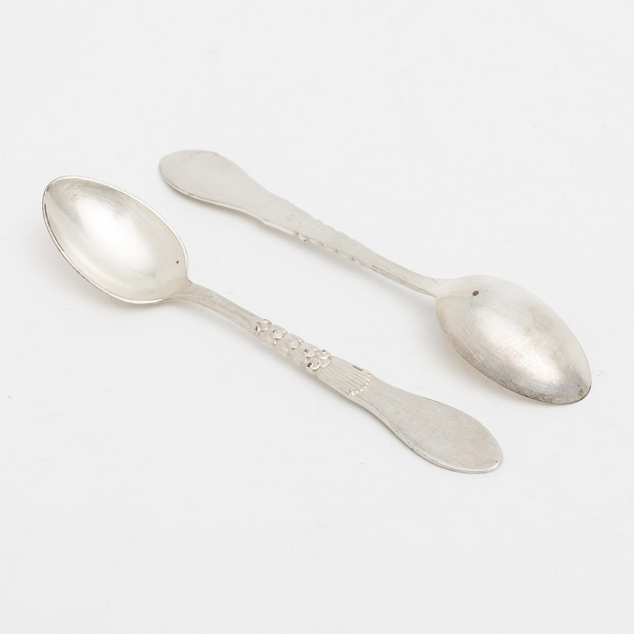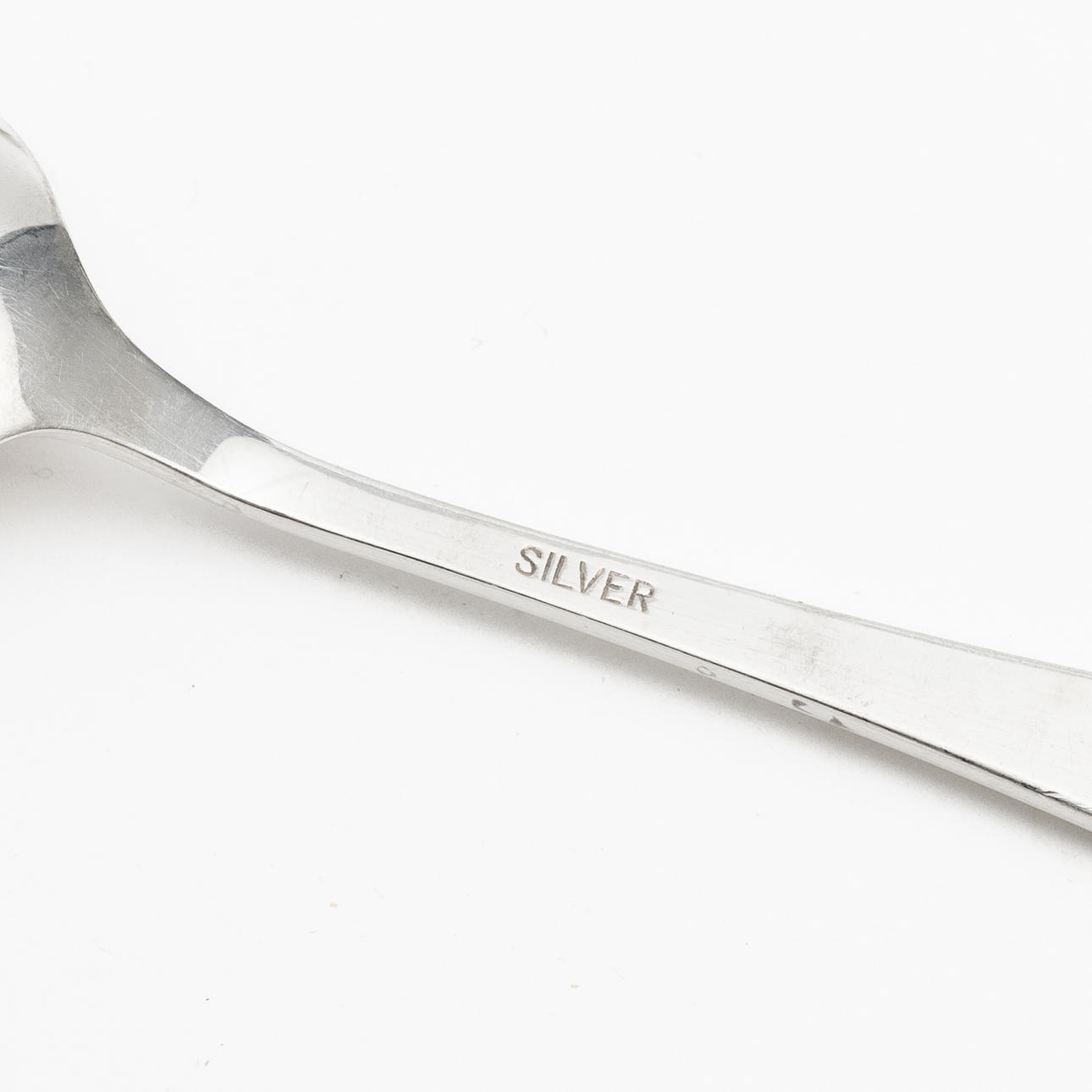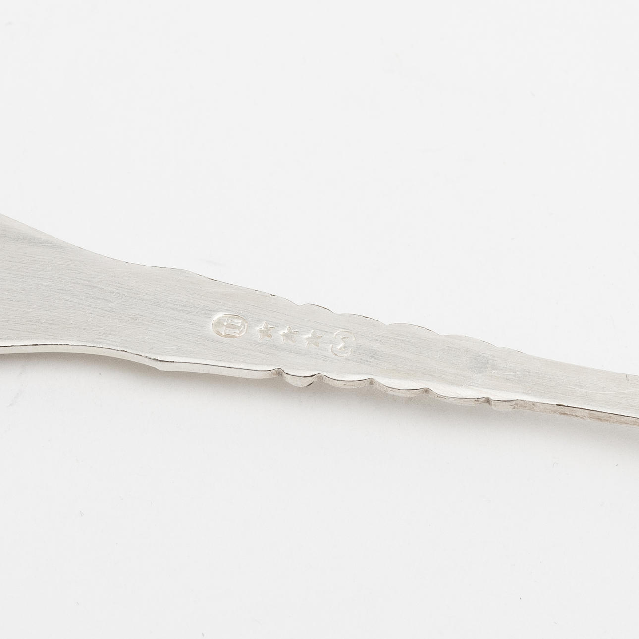 Sked 1949, längd ca 11,4 cm. Skedar. 3 st, längd ca 11,5 cm. Skedar, 5 st, längd ca 10,4 cm. Totalvikt ca 100 g.