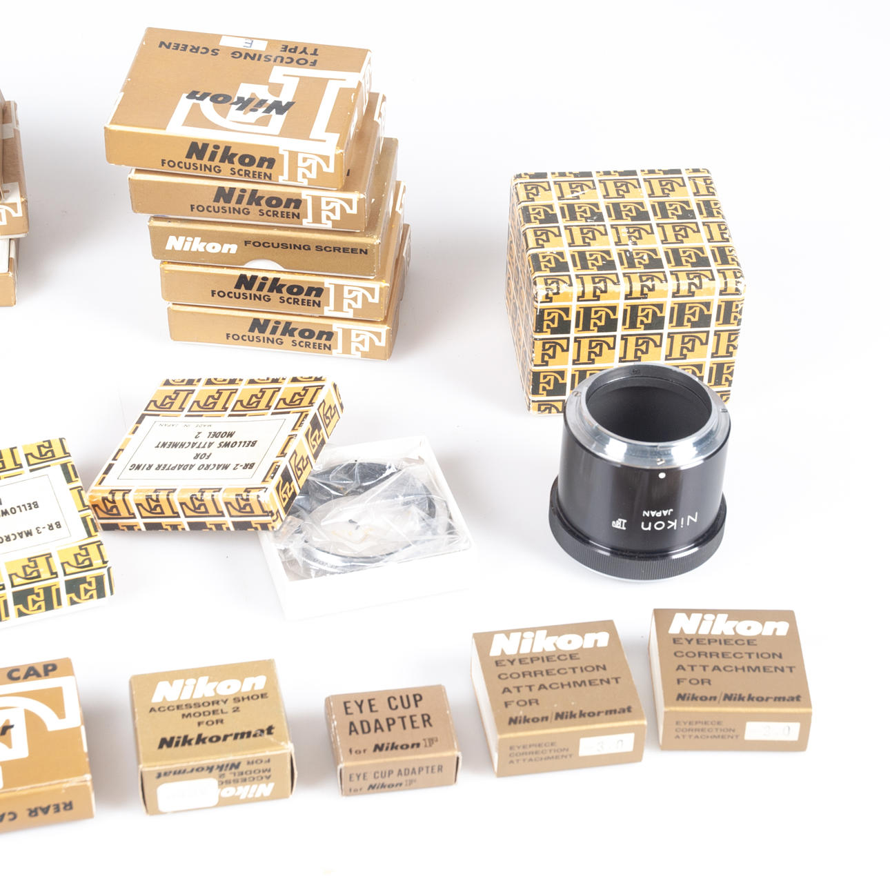 Diverse filter, ringar, adaptrar med mera. Mestadels till Nikon F, i originalkartong.