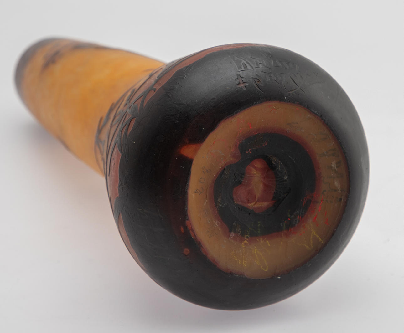 Färglöst glas med orange pulversmältning och mörkbrunt överlägg. Etsad dekor med roterande trumpetblommor. Martelé slipning något förstärkt på väggen till läpplinjen. Inskrivet ovanför stativet: Lorraine Cross och Daum Nancy, polerad. Längd: 31 cm.
