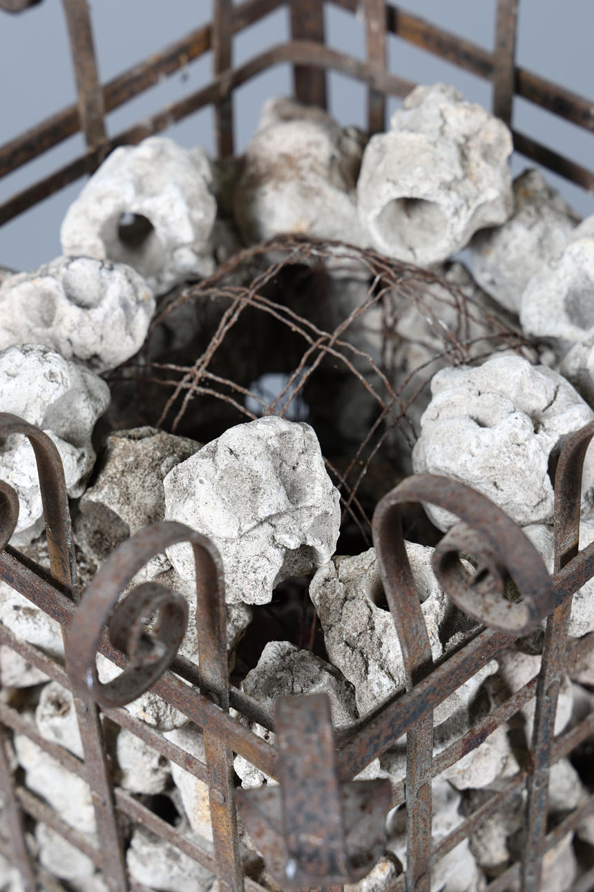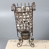 Elden med rullad kant, med stenar och brandeffektglasfoder, med oljereservoar under, omvandlad till el, säljs som samlarobjekt, 75 cm lång, 42 cm bred.