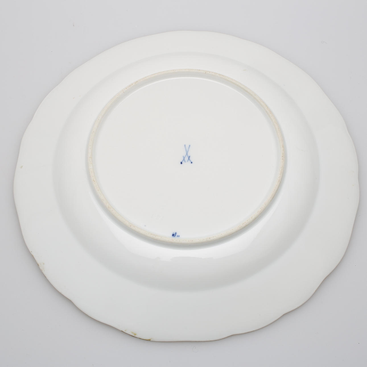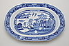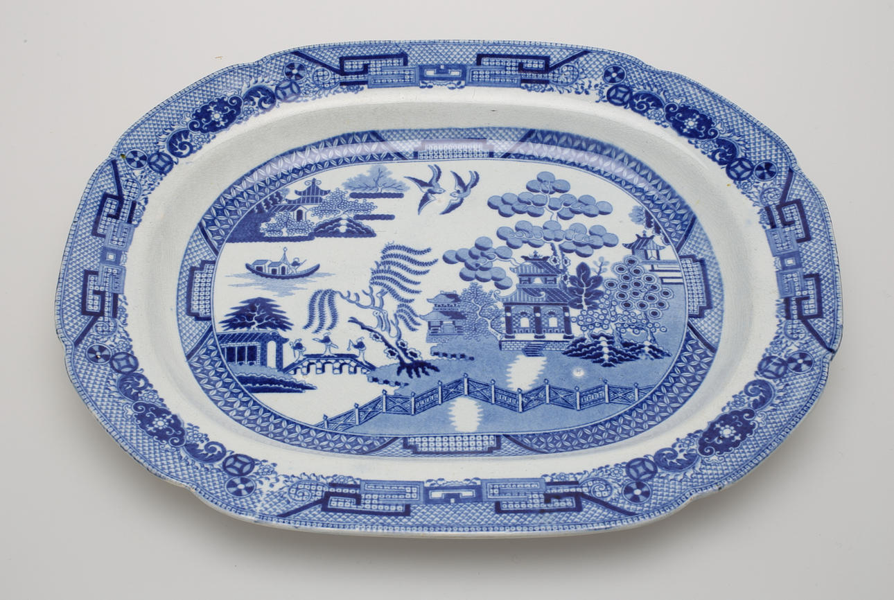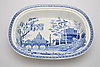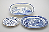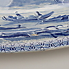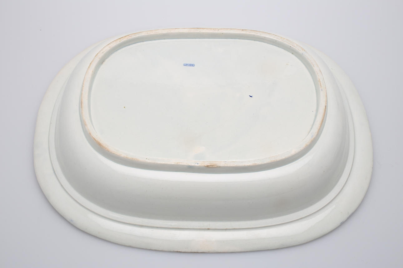 Uppläggsskål Spode höjd 8 cm, längd 42,5 cm. Uppläggsfat längd 38,5 cm. Djup tallrik Meissen-liknande märkning diameter 24,5 cm.