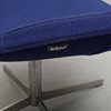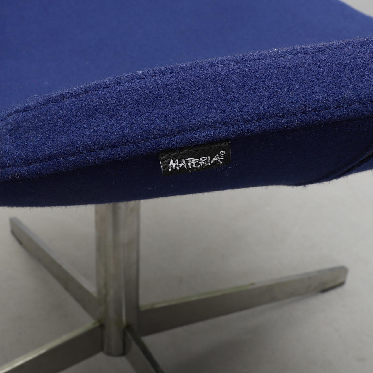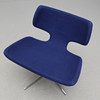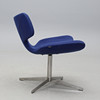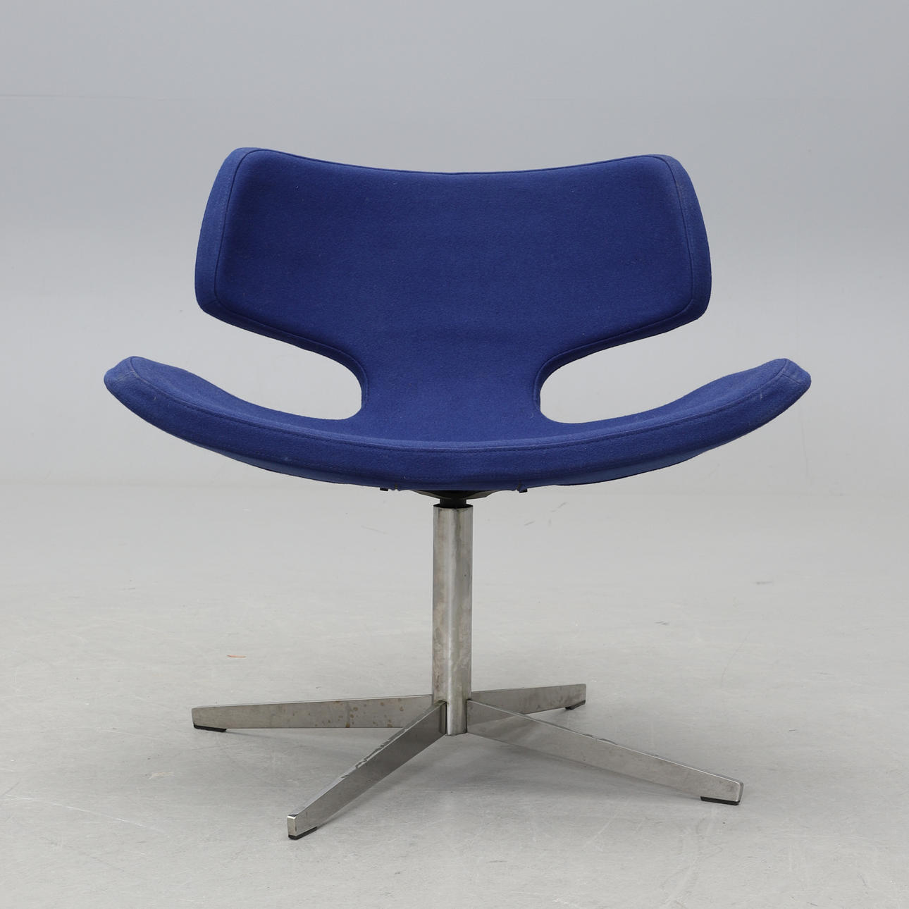 Kromad stålrörsfot, fyrdelad. Snurrbar. Blå textilklädsel. Bredd 76, rygghöjd 73, sitthöjd 43 cm.