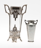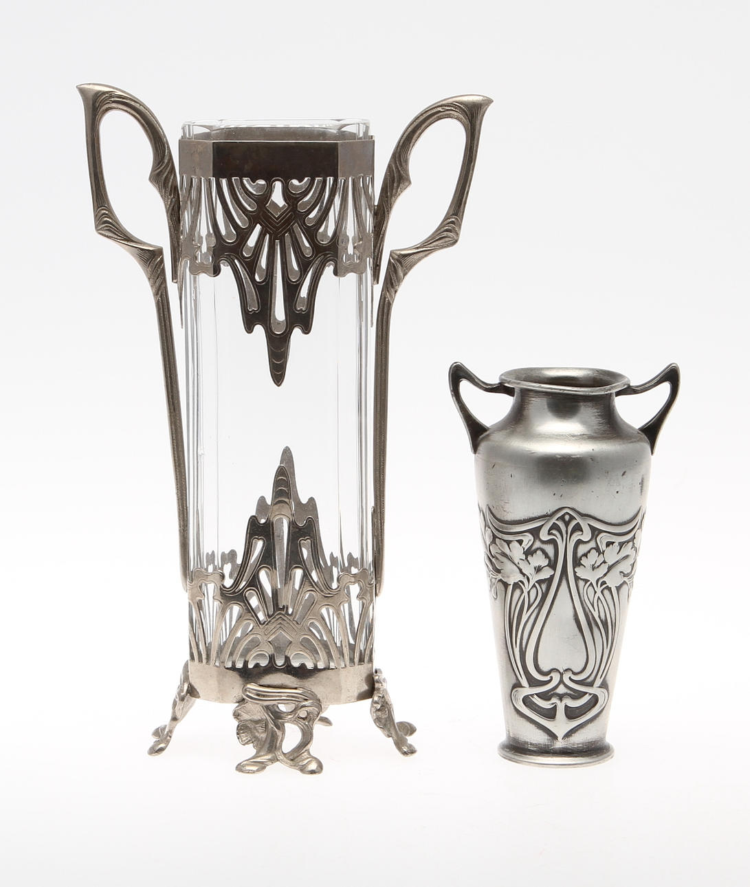 Tenn. Vas med dekor av botanik samt genombruten dekor med glasinfattning. Höjd 13-23 cm.