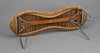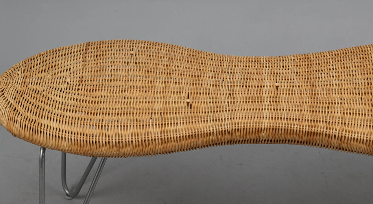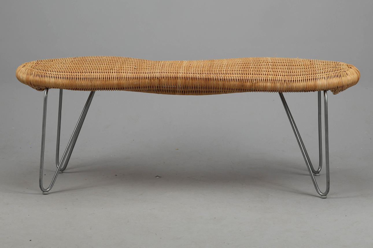 Stomme av metall, sits av flätad rotting, mått 110x37 cm, höjd 42 cm.