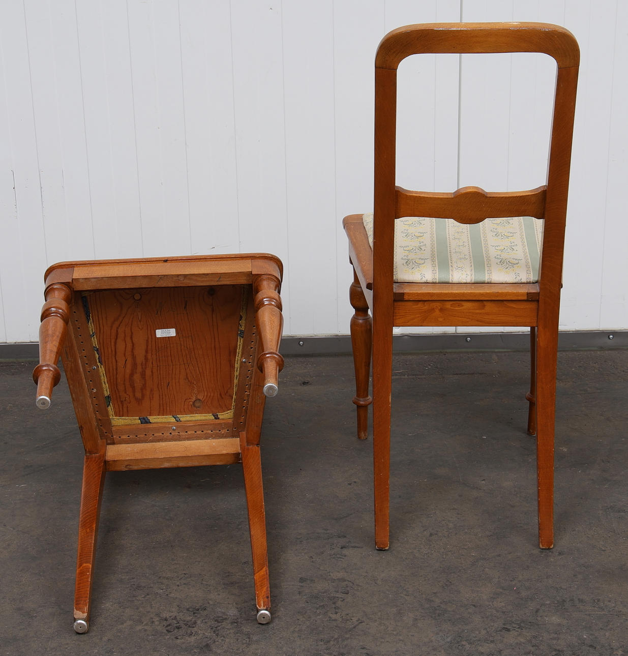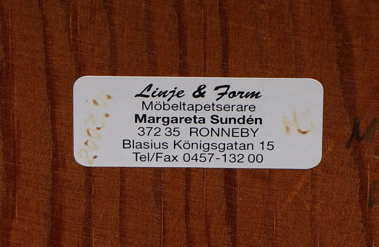 Omklädda med tyg. Två stolar med annat tyg. Bredd 42, sitthöjd 49 cm och rygghöjd ca 94 cm.