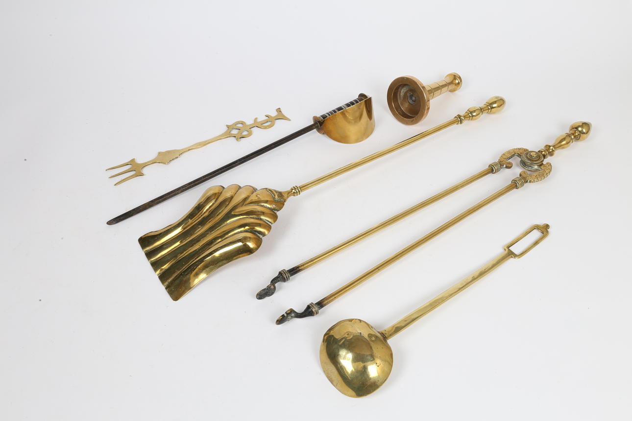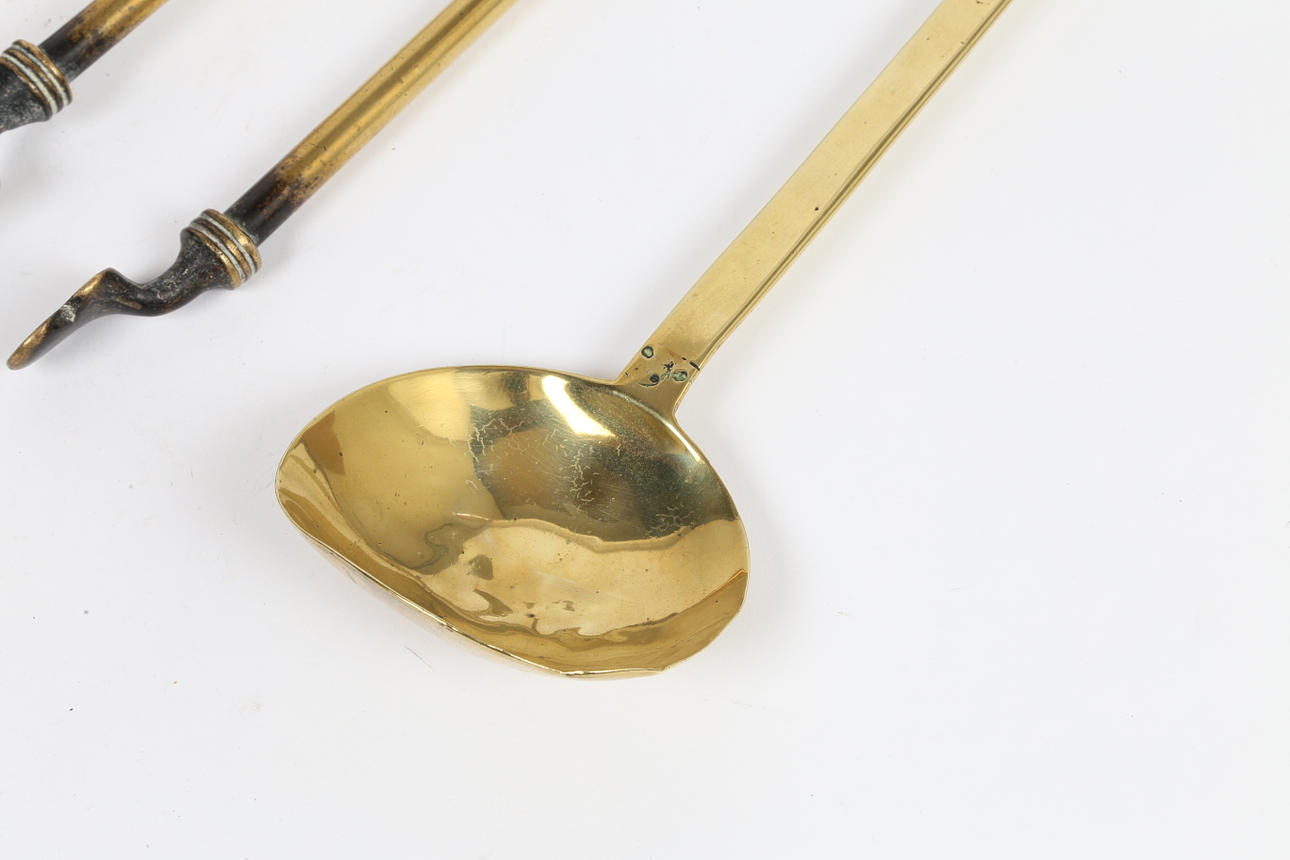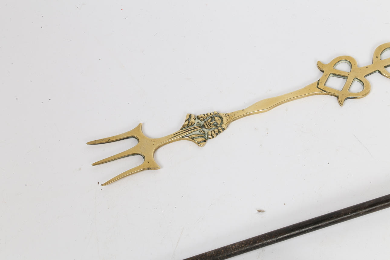 skalformad spade och tång, tillsammans med en falsk svärdpoker i stativ, slev och gaffel, spaden 64cm hög (6).