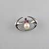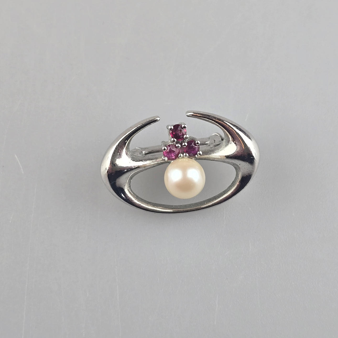 oval konkav art nouveau-form med pärla och röda ädelstenar, mått 2,5 x 1,6 cm, vikt ca. 3,7 g, lås med säkerhetsklämma.
