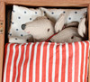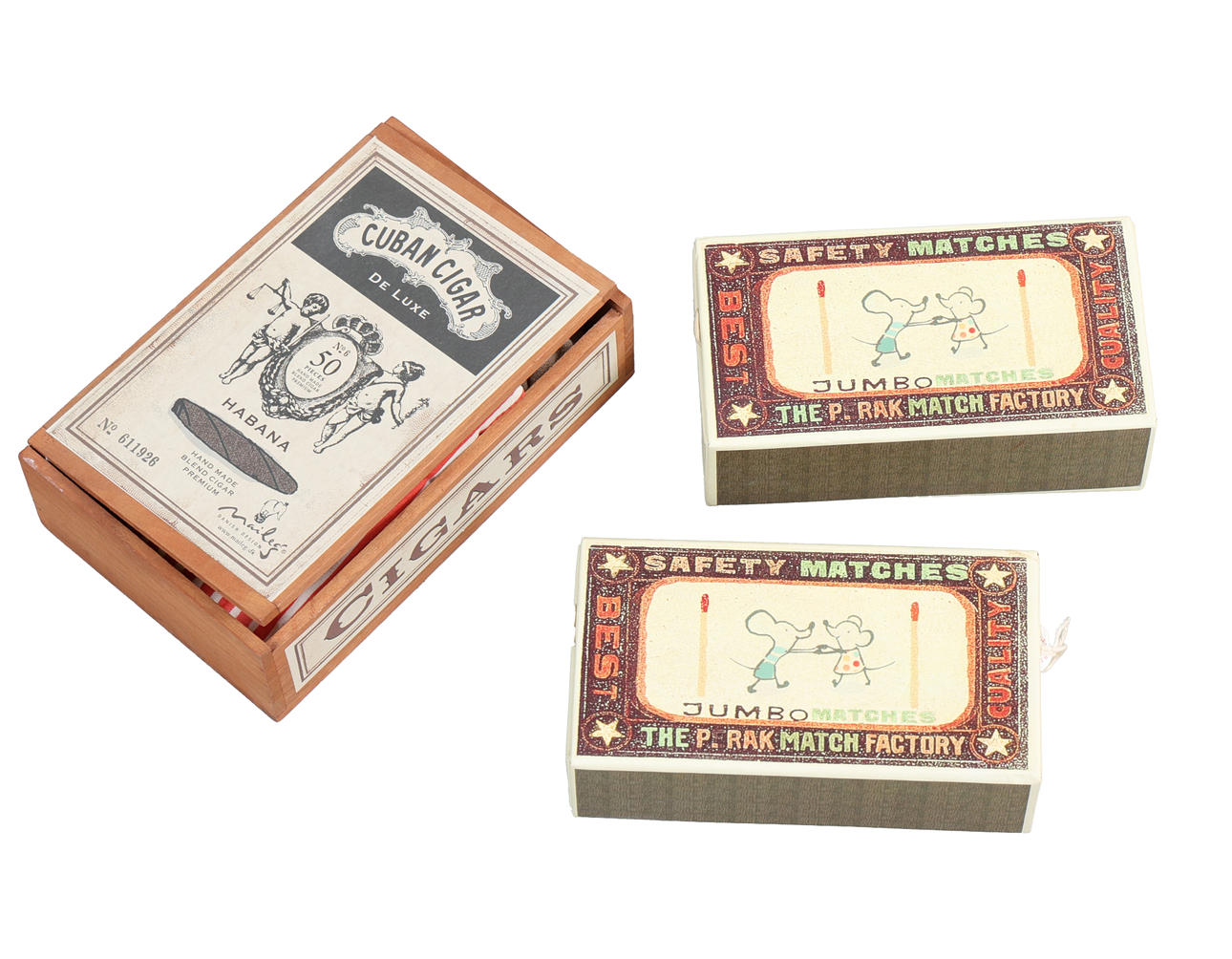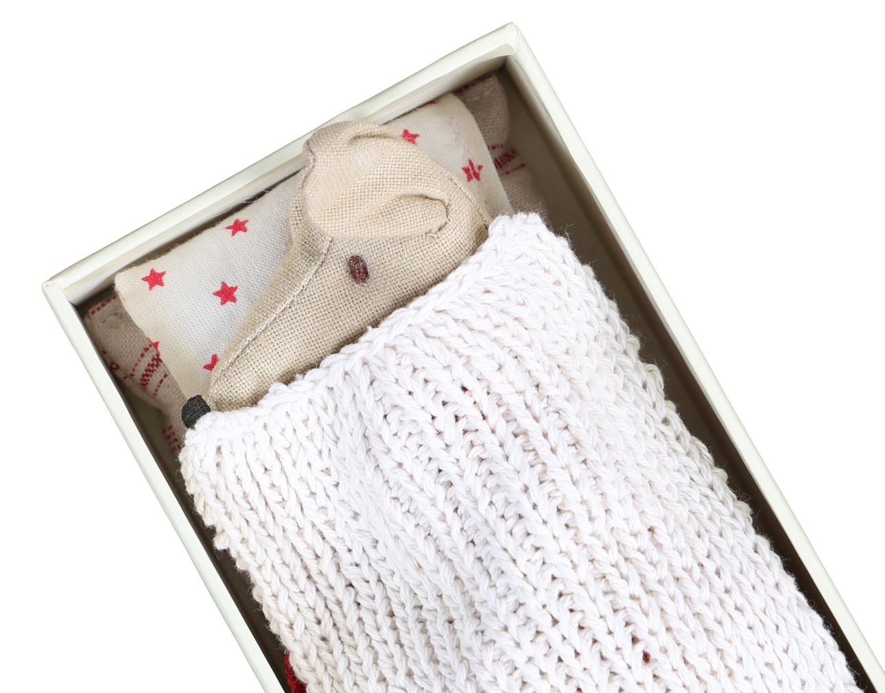 Bestående av en mummimus i låda med sängkläder och filt, och en pappamus i låda med sängkläder & filt och två möss i en cigarrlåda av trä. Alla med originaltaggar. Största lådan mäter 12,5 cm x 19,5 cm x 5,5 cm.