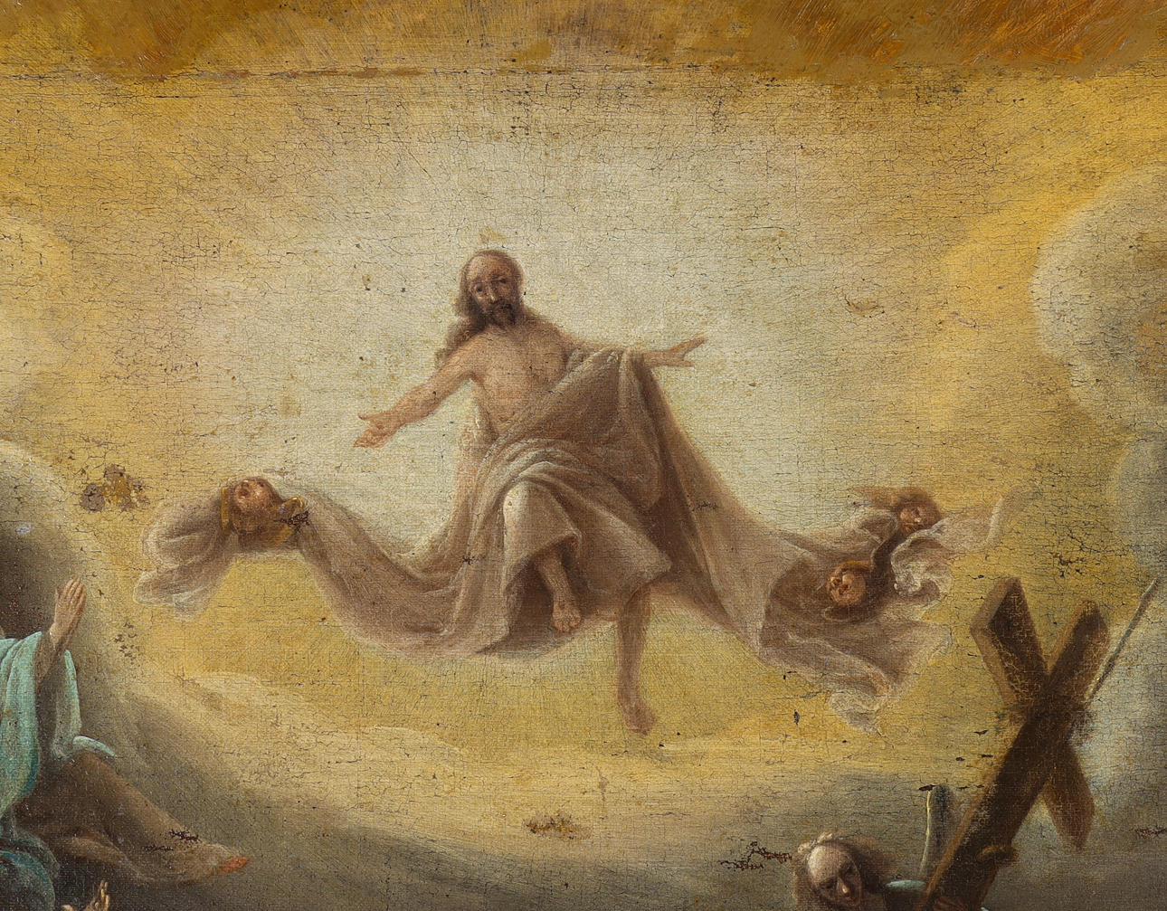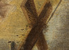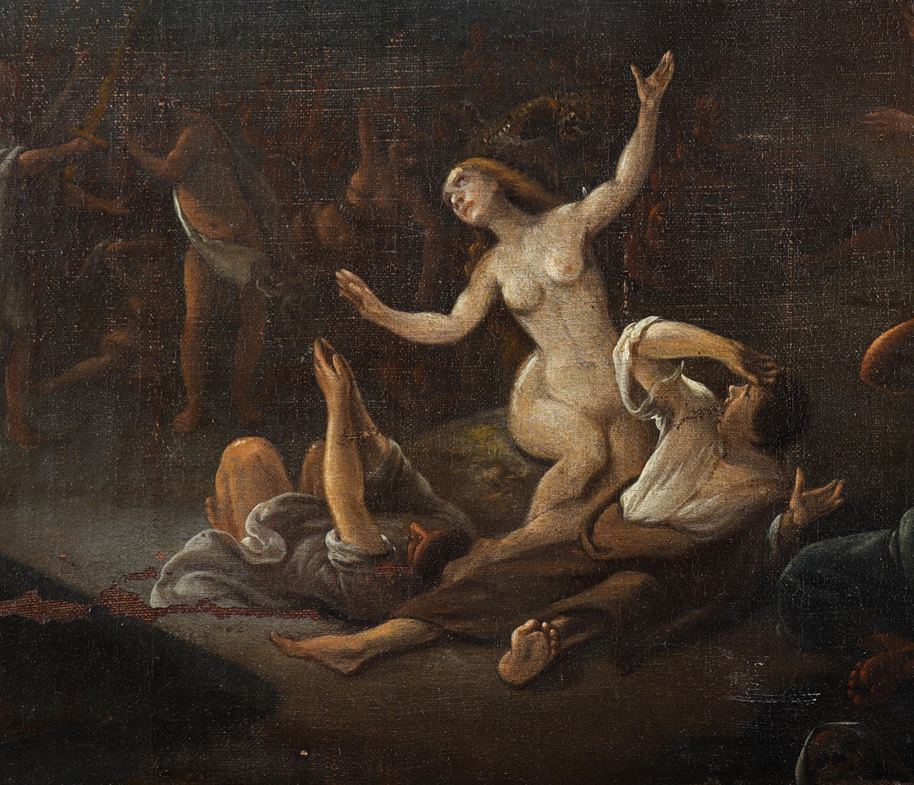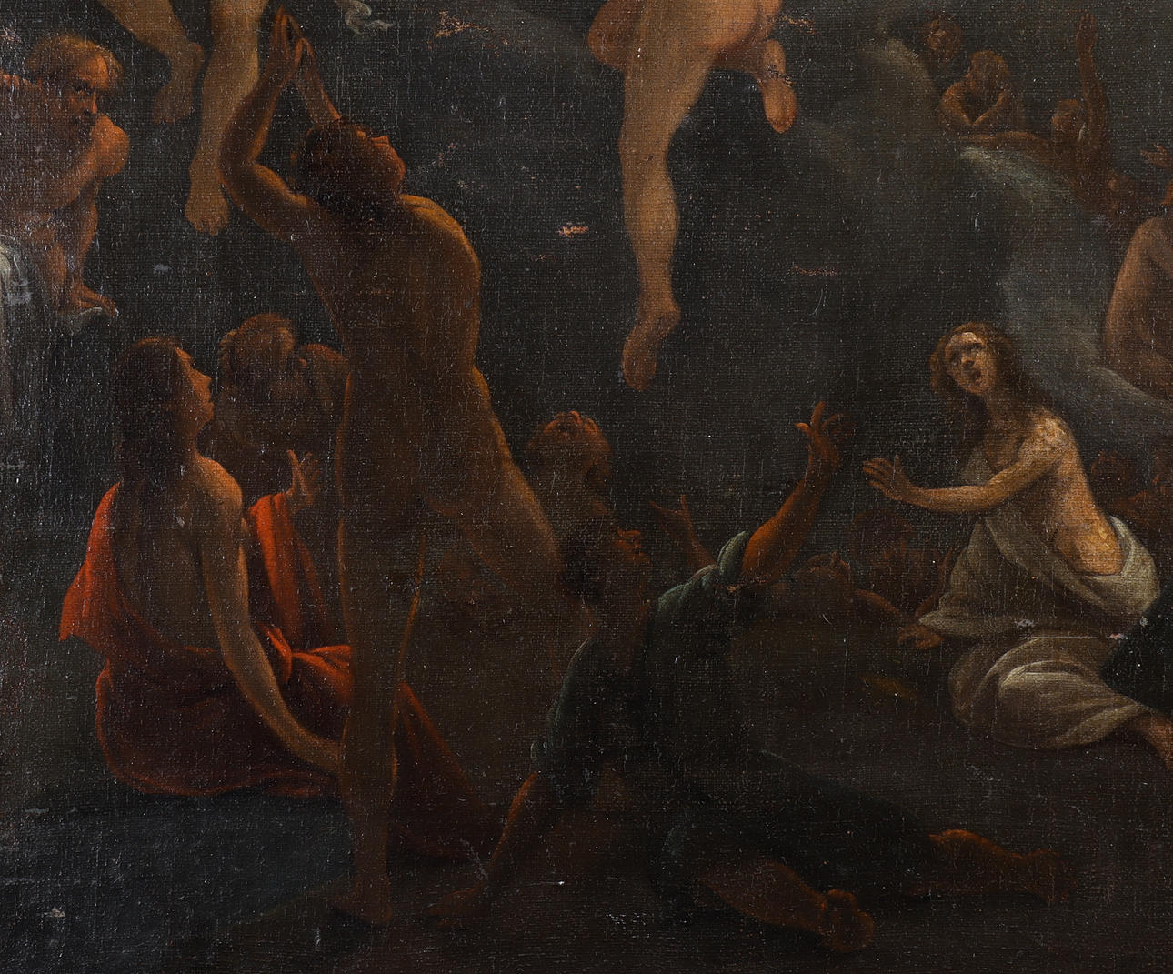 Ytslitage. Ytsmuts. Färgbortfall. Ställvis krackelyr. Renoverad. Uppfodrad duk. Retuscher. Märken efter spännram.