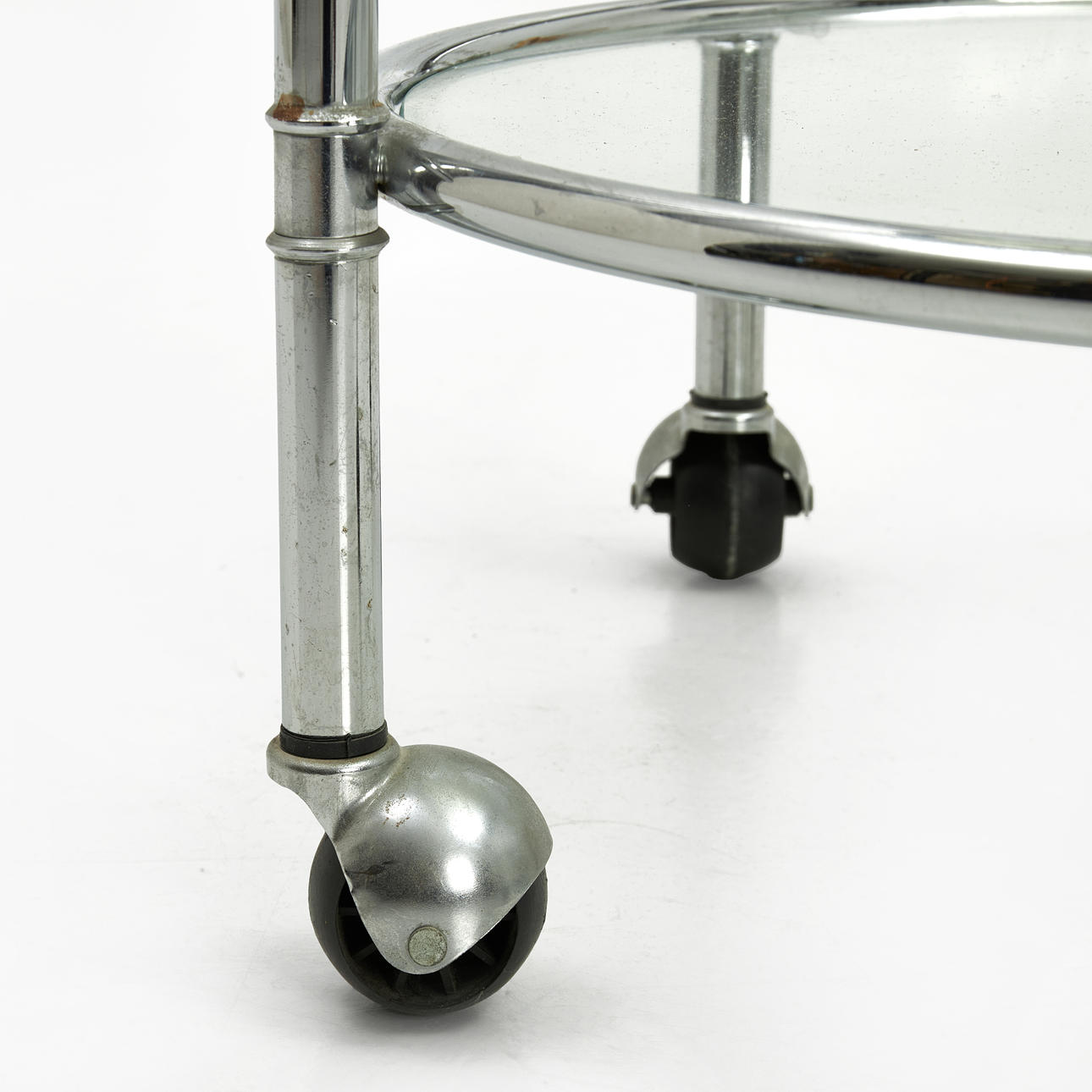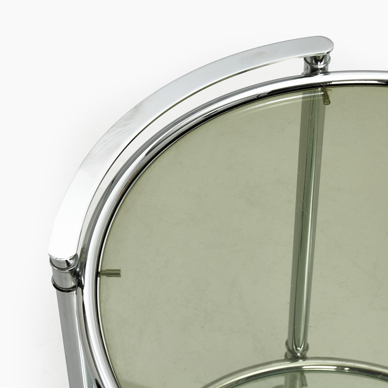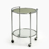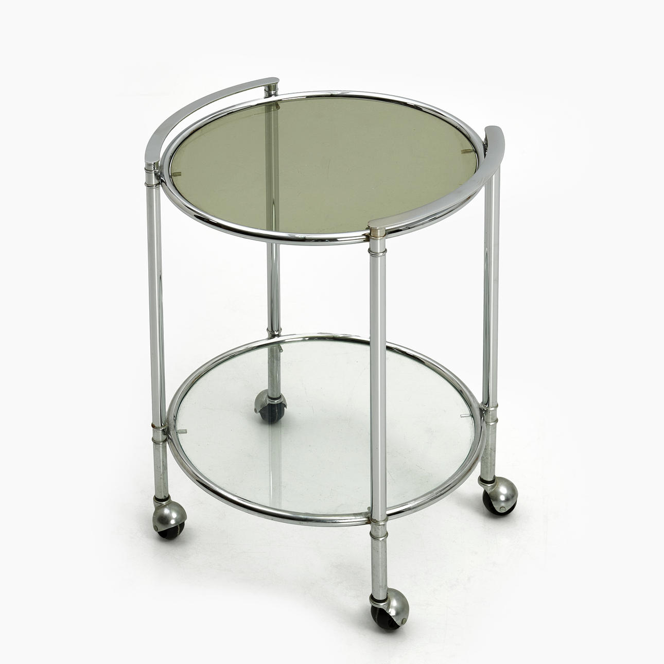 Två hyllplan i röktonat glas resp. klarglas. Höjd ca 61.5 cm, diameter 45 cm. Bredd inkl. handtag 48.5 cm.