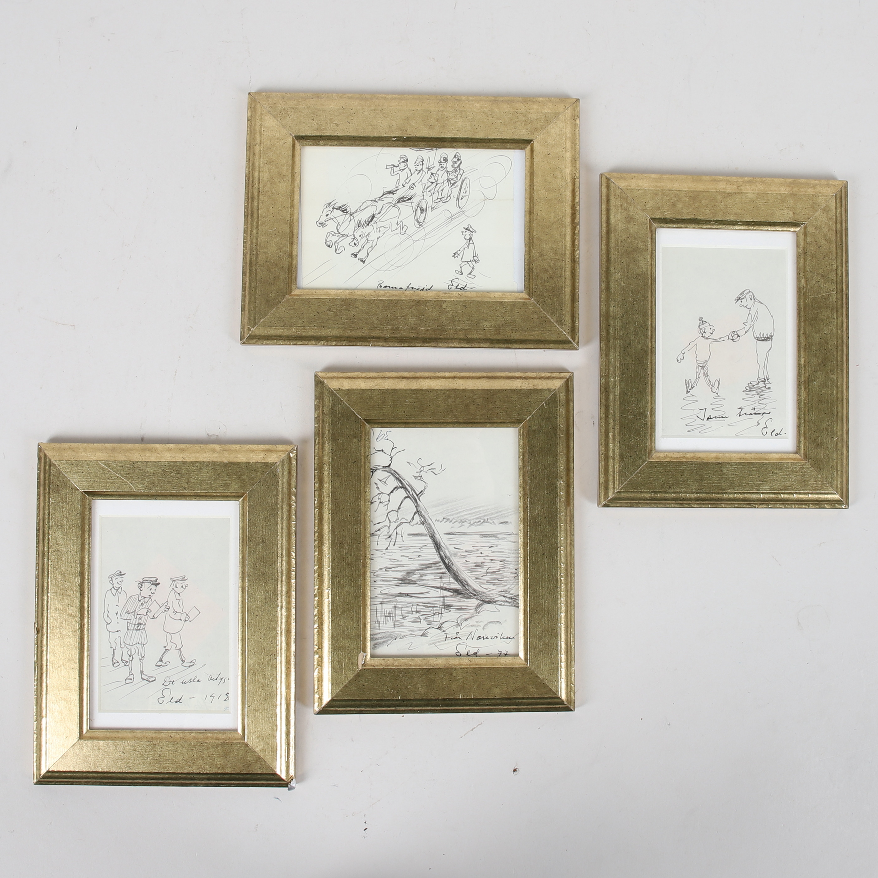 3915828. OIDENTIFIERAD KONSTNÄR. Teckningar, 4 st, signerade Eld, 1900-tal.