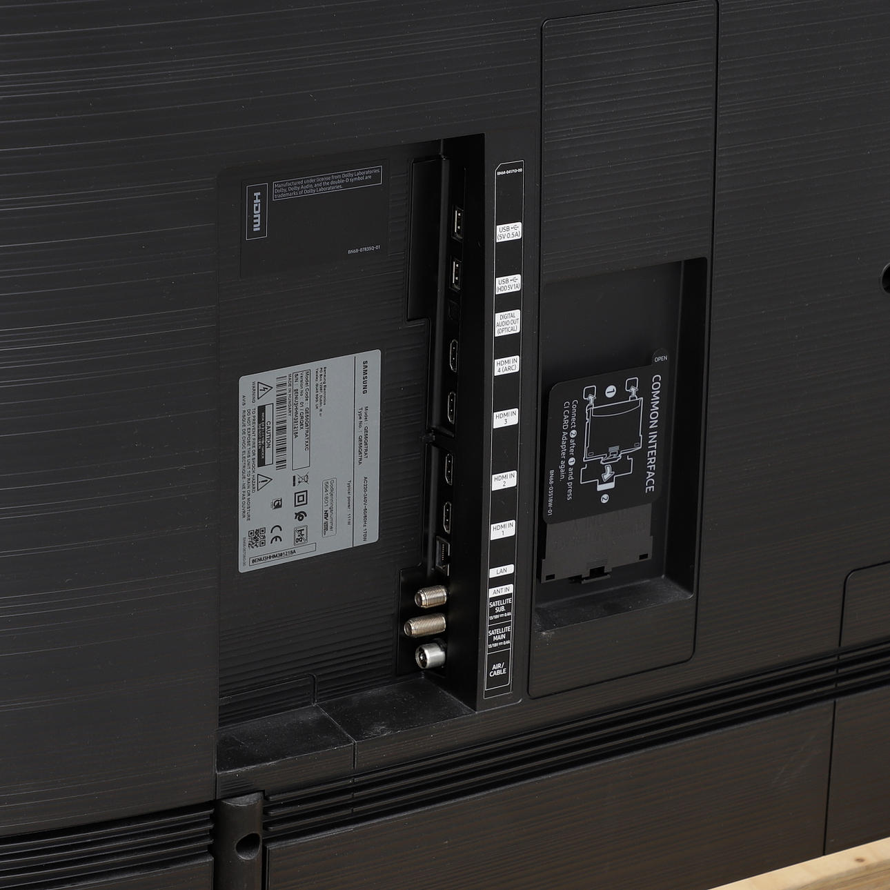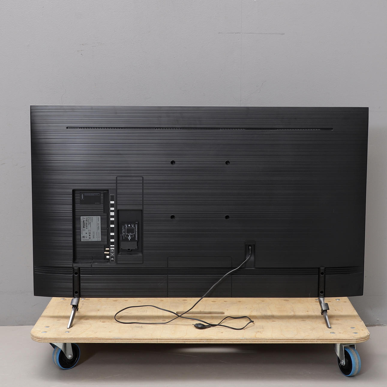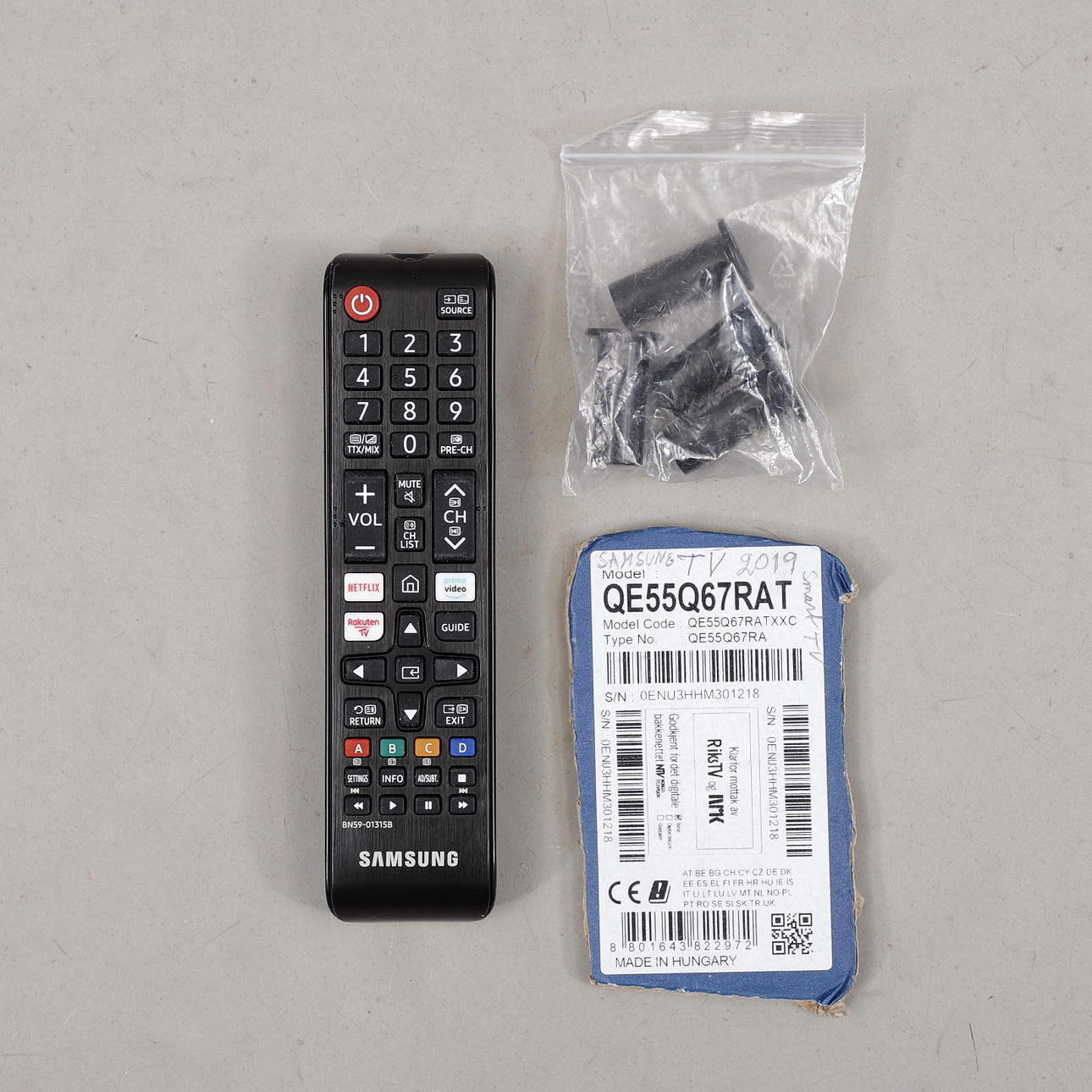 Höjd med benställning 79 cm, bredd 124 cm. Modell QE55Q67RAT. Fjärrkontroll medföljer.