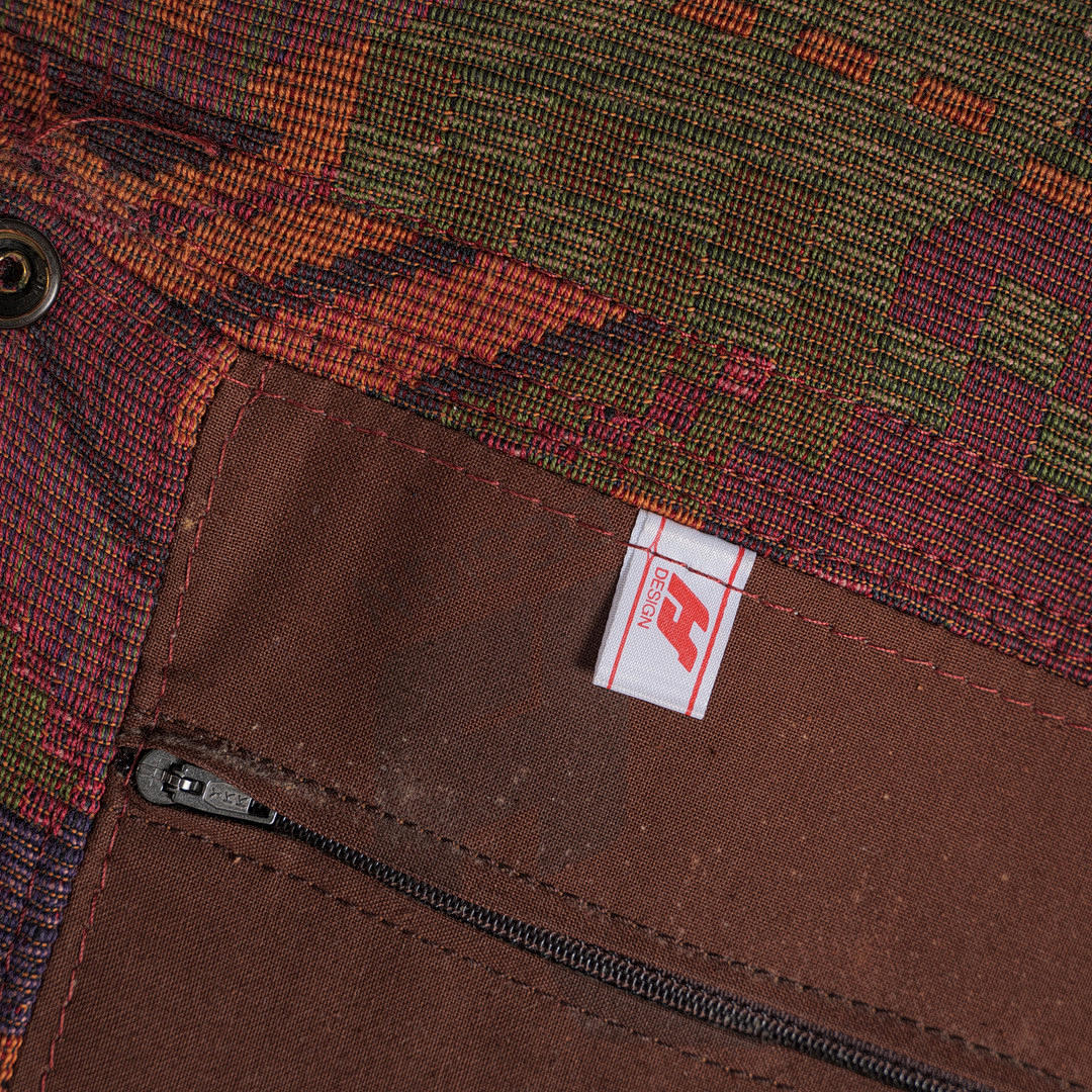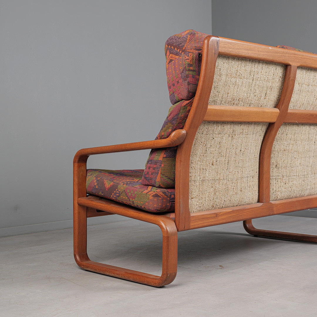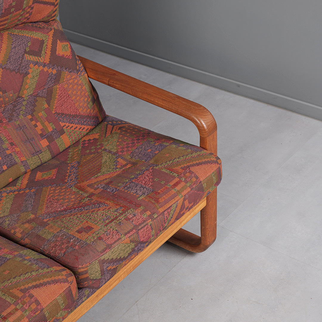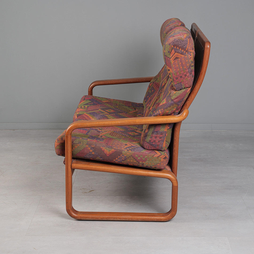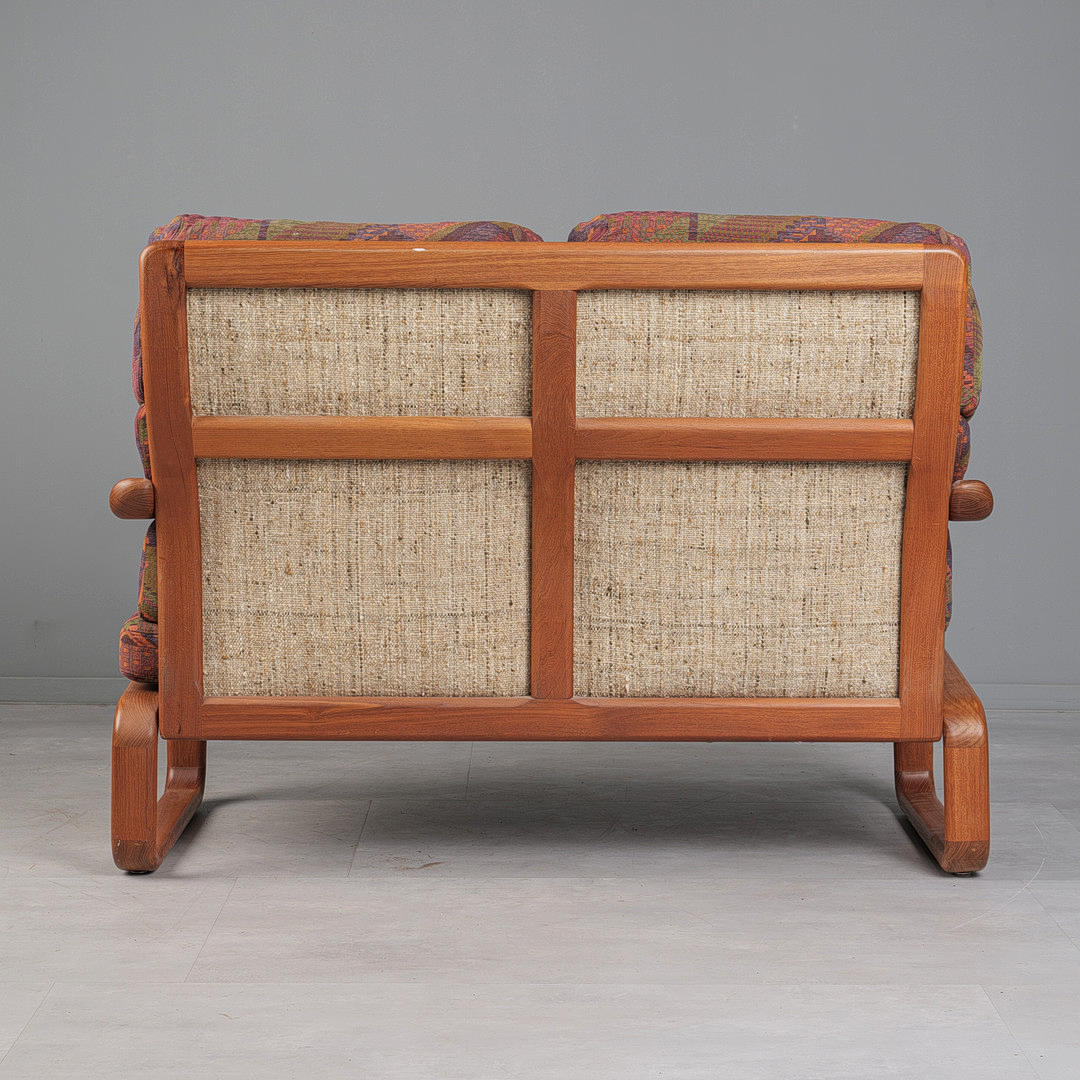 Konstruktion med glaserad teakram, med armstöd, med avtagbart tyg sits och ryggklädsel, polykrommönstrad, krämvit ullklädsel på ryggen, h.98cm klädsel, sitshöjd: 44cm, L.134cm, D.70cm.