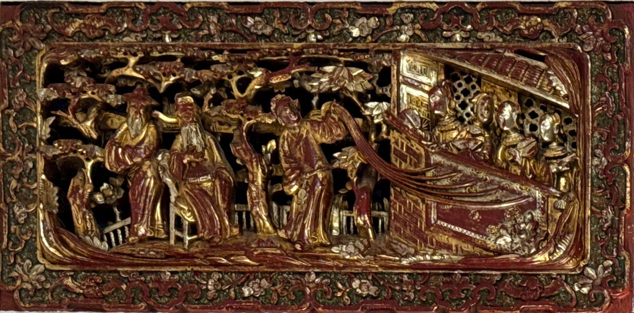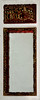 En väggdisplay i trä som innehåller en matchande kinesisk snidad rödmålad och förgylld dekorerad panel och en rödmålad och förgylld inramad spegel, 106 x 51 cm.
