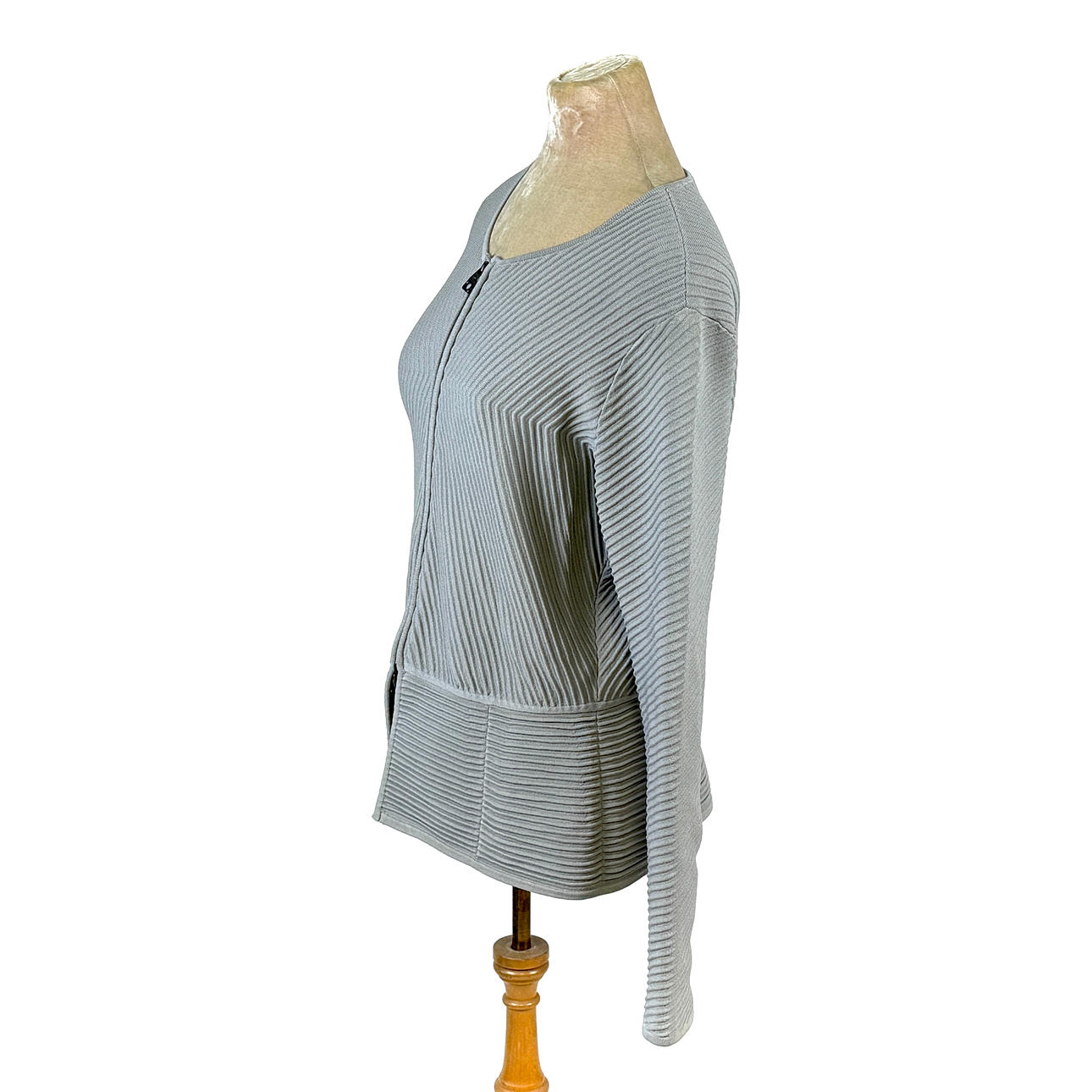 Emporio Armani långärmad damjacka tillverkad av texturerat stretchigt stickat tyg i grå/olivfärg. Storlek 46 på taggen.