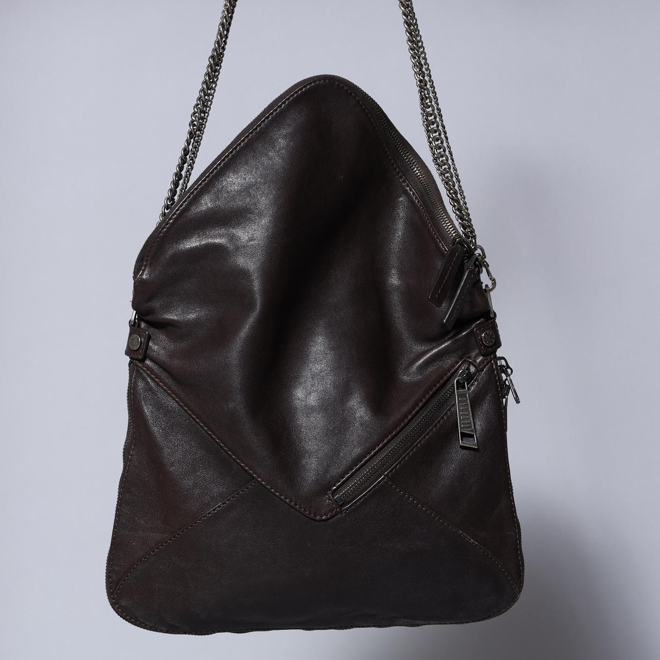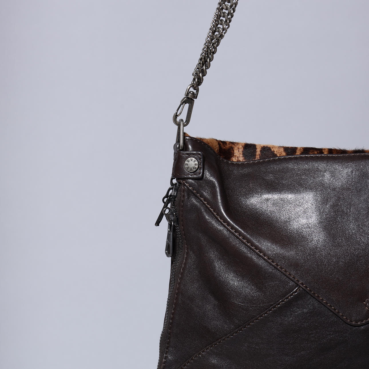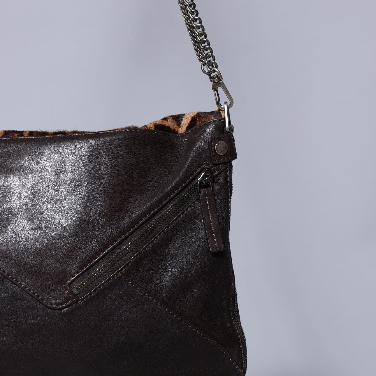 Brun läderväska med leopardmönstrat läder. Exteriör med dragkedja som gör väskan större och mindre fack med dragkedja. Hårdvara av metall (gunmetal). Invändigt fack med dragkedja.