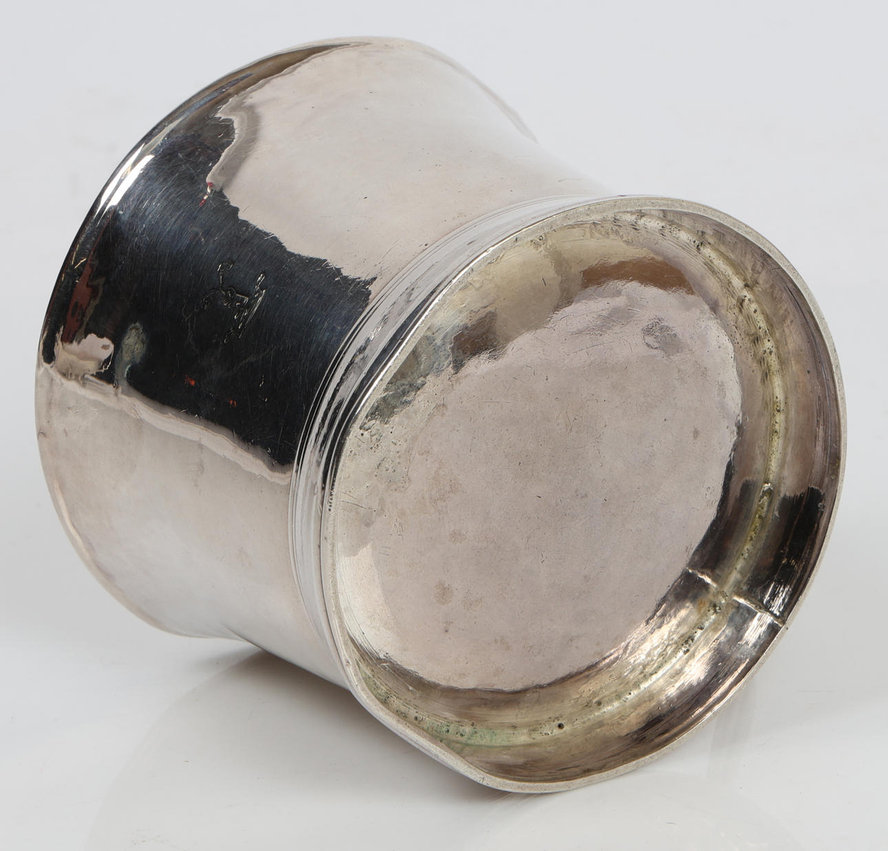 London 1798, tillverkarens märke delvis gnidat, med kantigt handtag, utsvängd kropp och rödsutsvängd fot, kroppsvapnet visar en hand som håller två fjädrar, 11,5 cm bred, 9 cm diameter, 7 cm hög, 6 oz.