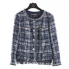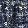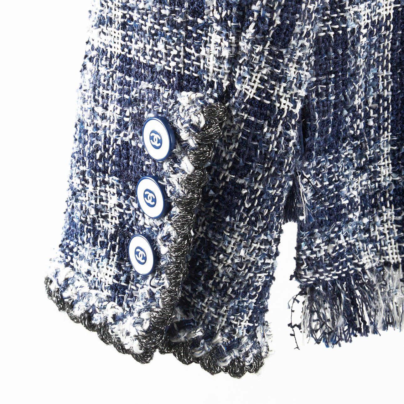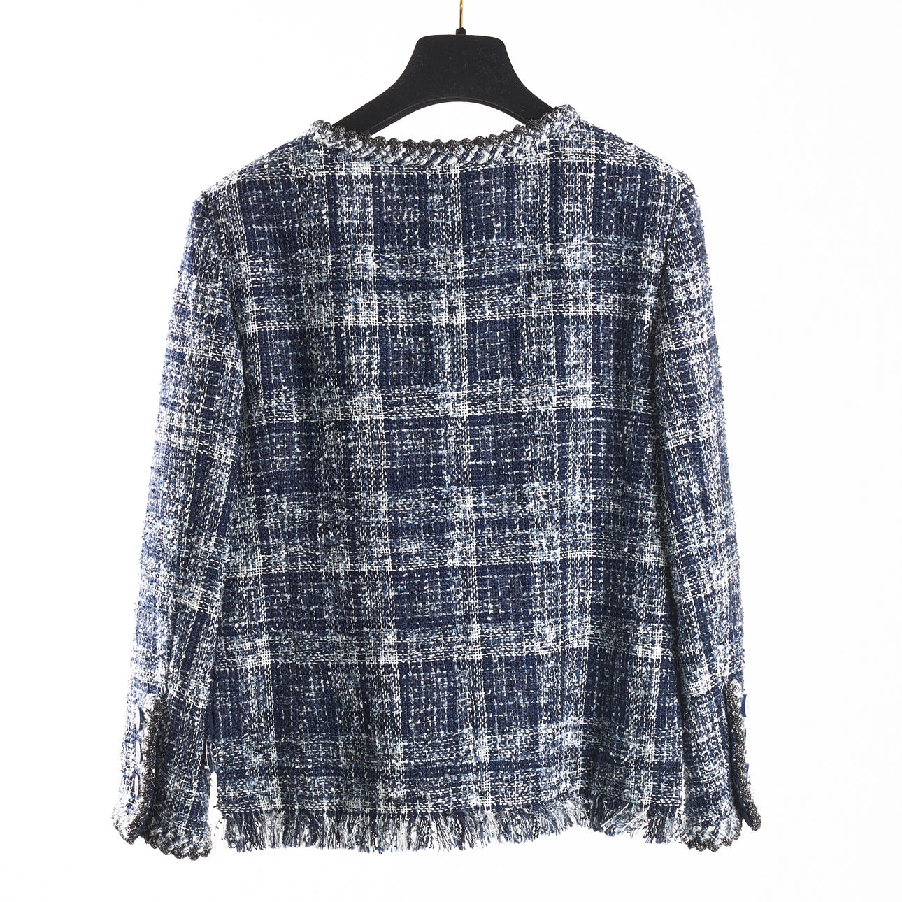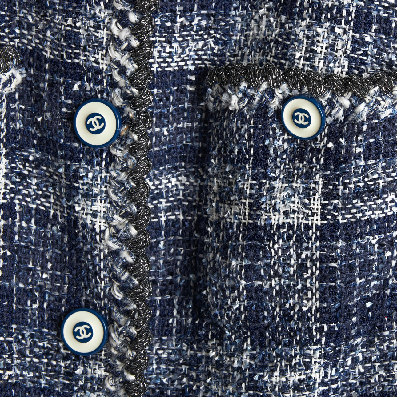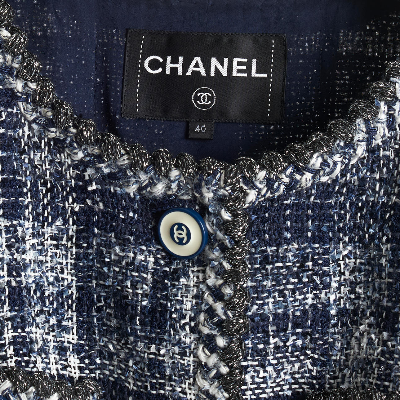 Klassisk Chanel jacka i mörkblå- och vitrutig bouclé med vit/blå knappar med CC-logga, fodrad med mörkblå siden samt med avslutande kantkedja. Etikettmärkt "CHANEL" och enl märkning fransk storlek 40.