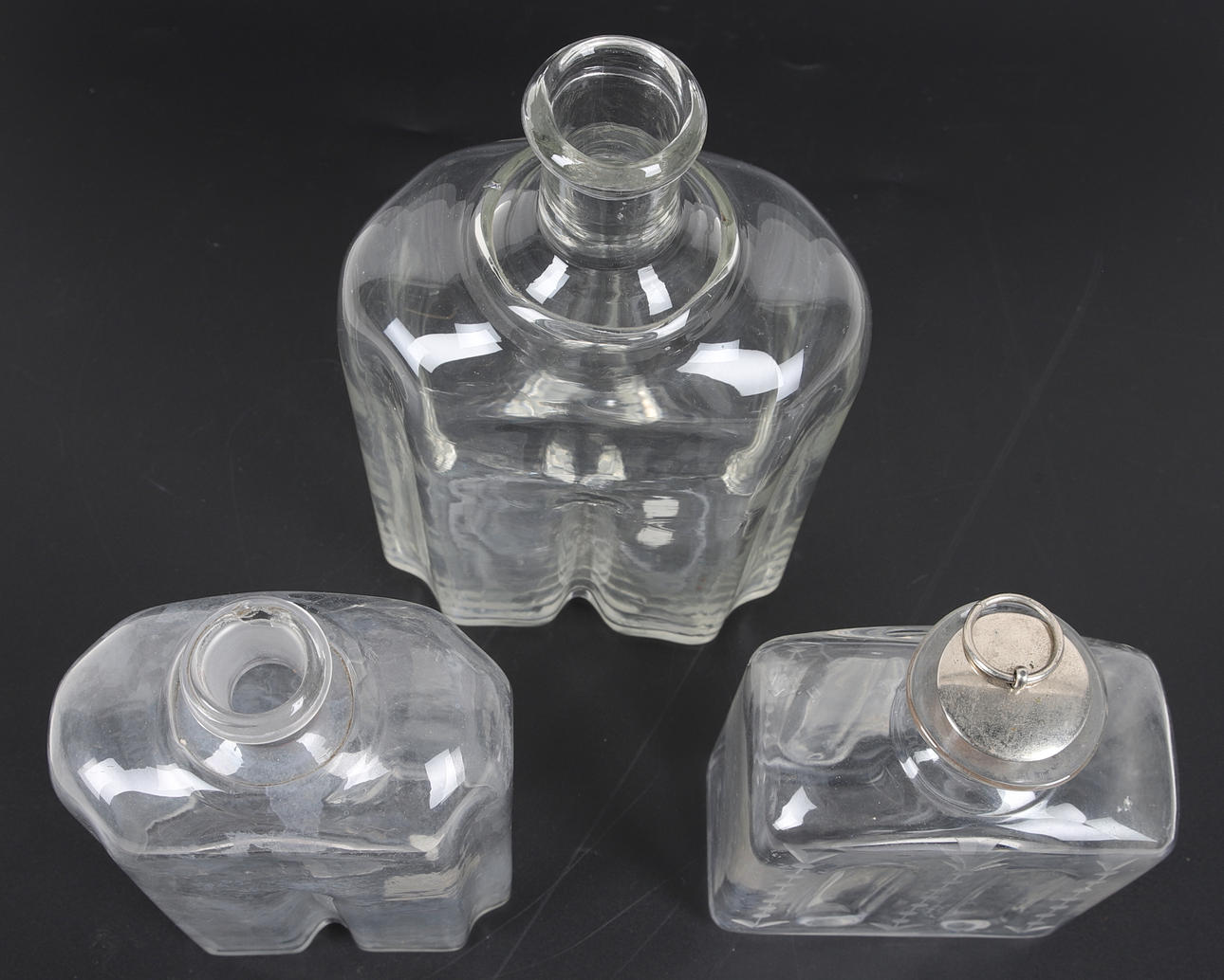 3938346. KARAFFER/GREPPAFLASKA, 3 st, glas, munblåsta.