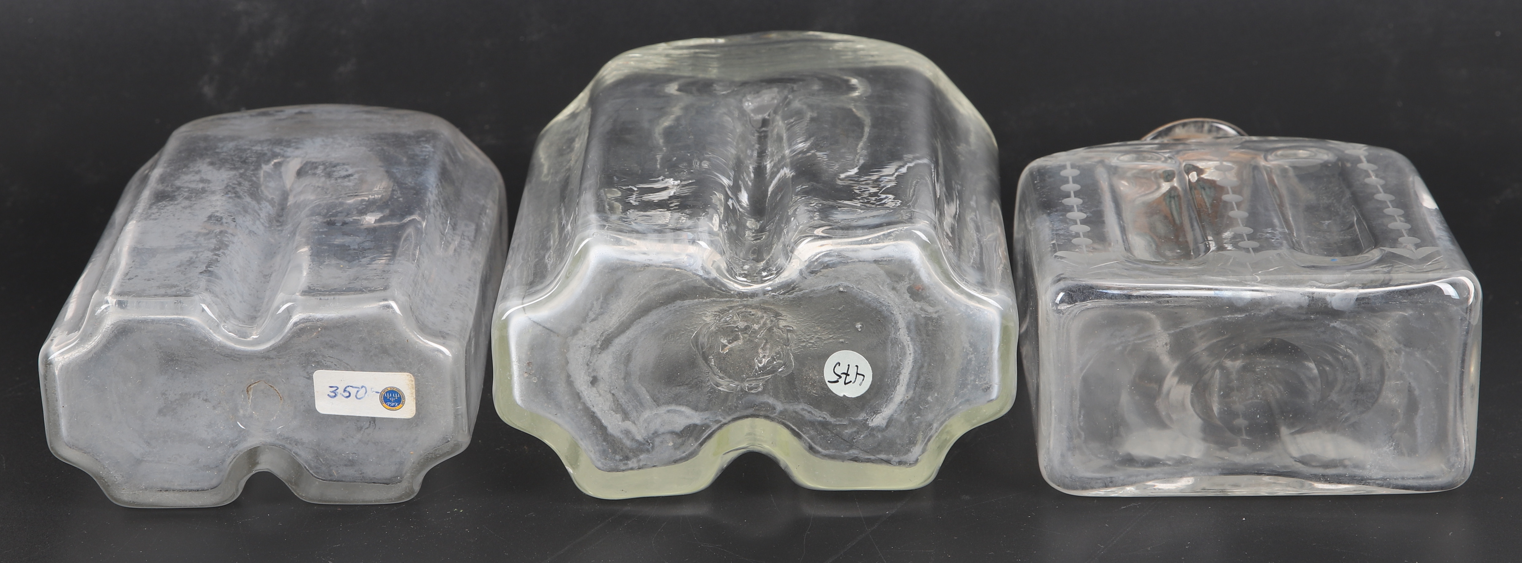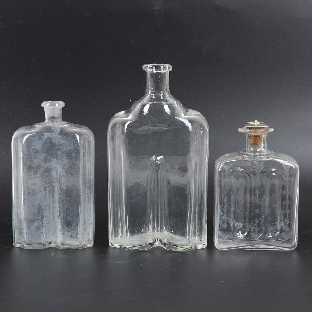 3938346. KARAFFER/GREPPAFLASKA, 3 st, glas, munblåsta.