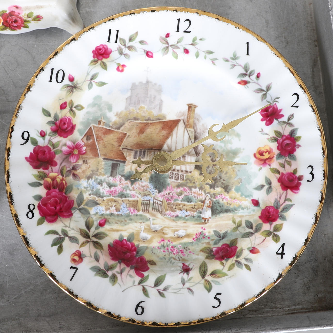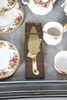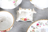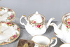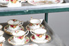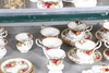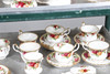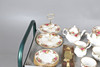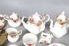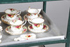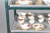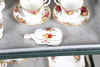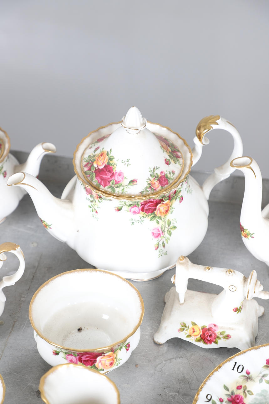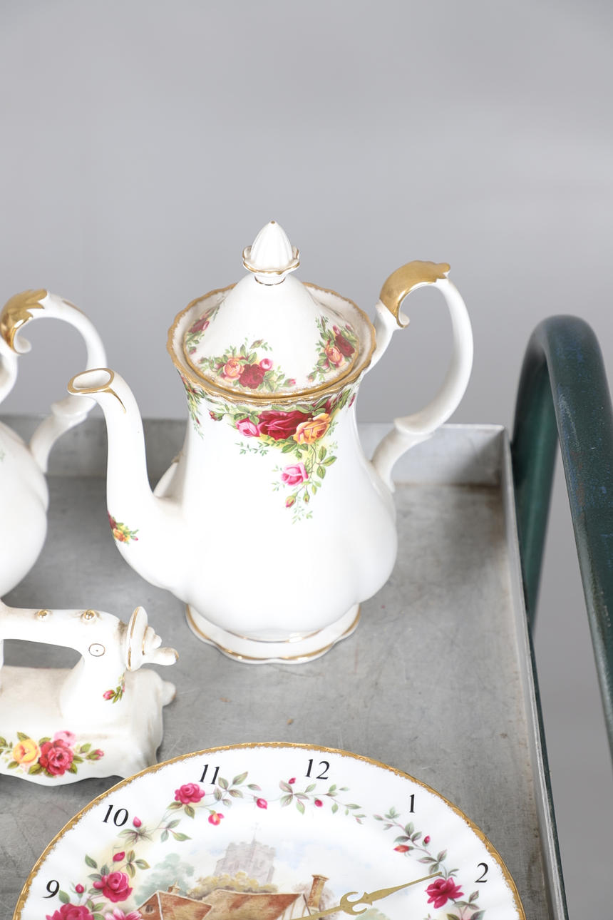 Ett blandat parti inklusive en kaffekanna (23 cm hög), tekanna (18,5 cm hög), mindre tekanna (14 cm hög), olika tekoppar och fat, klocka, kakställ, mjölkkannor, tårtskiva och andra diverse föremål. Även med en Cottage Rose symaskin och lockbox i form av ett instrument.