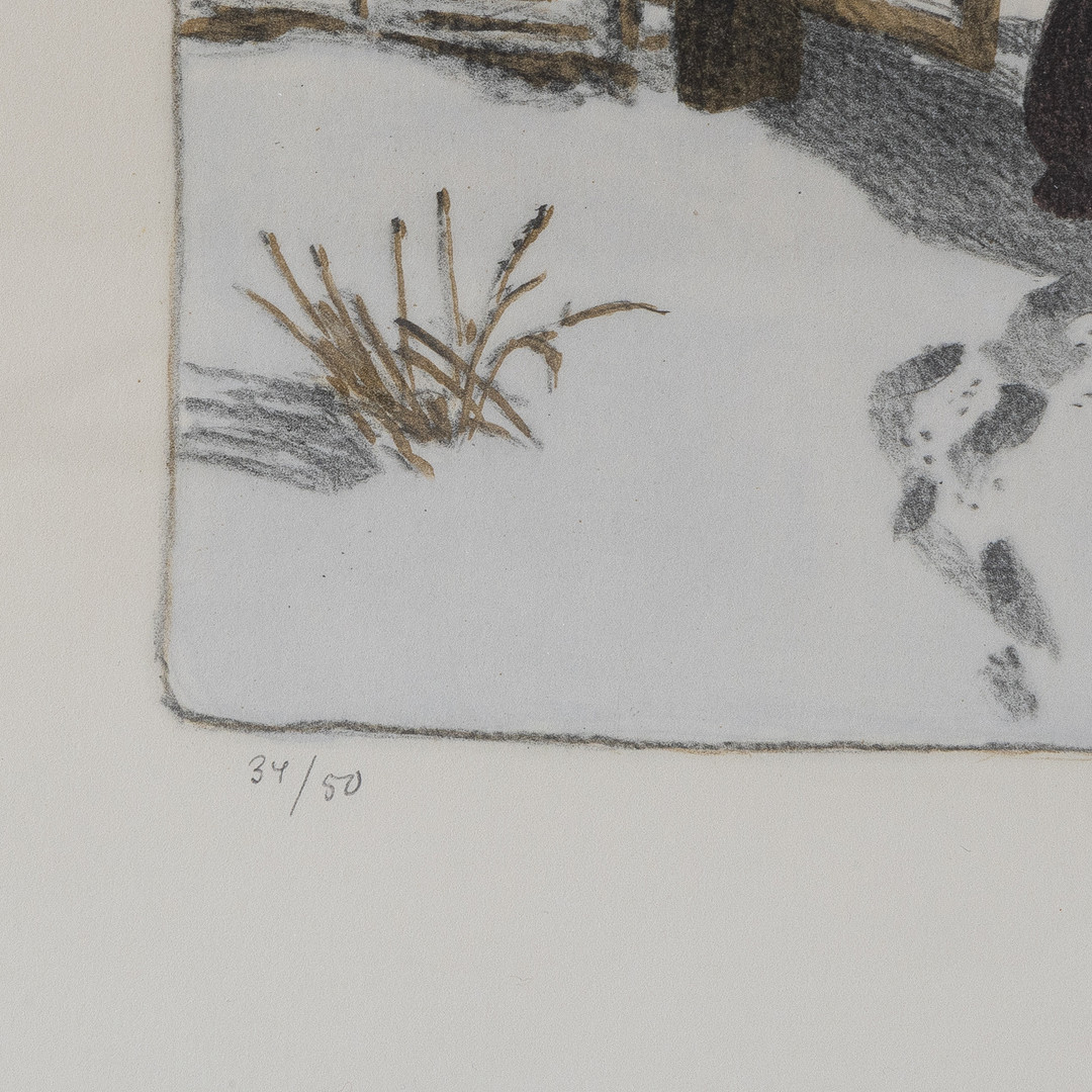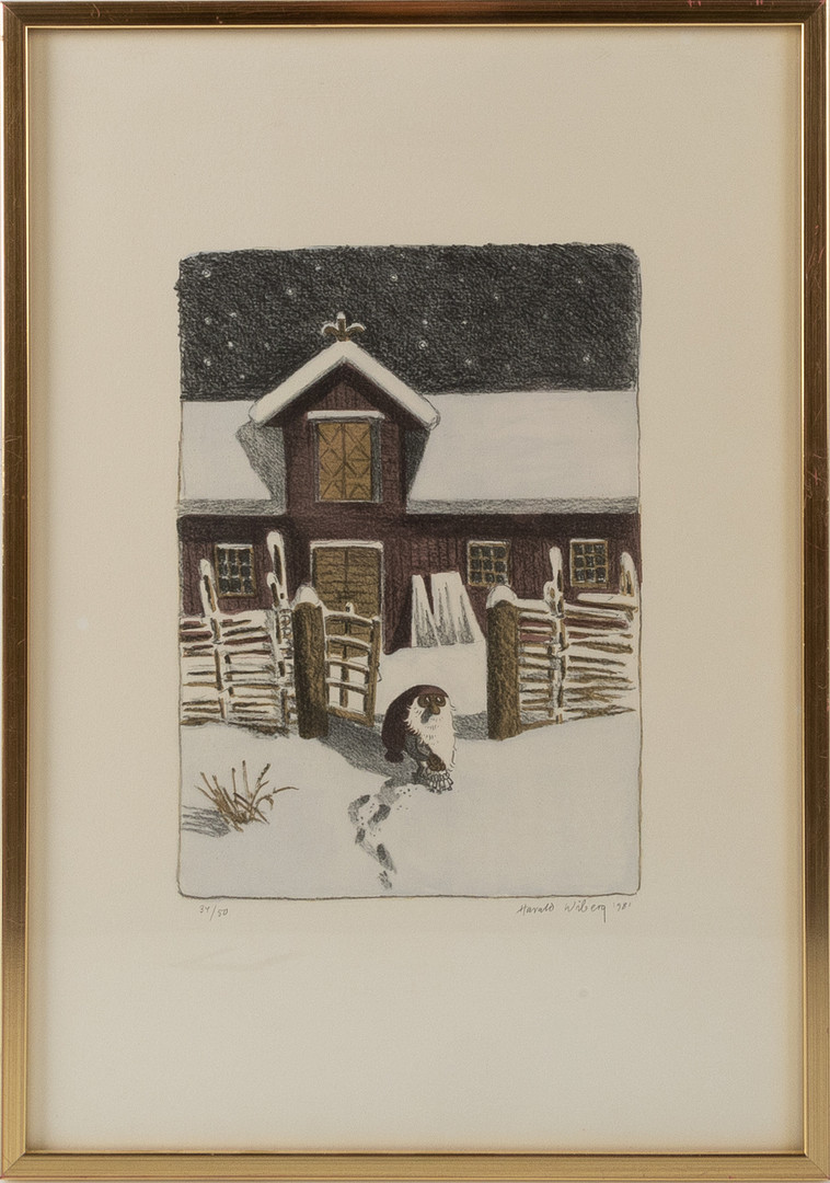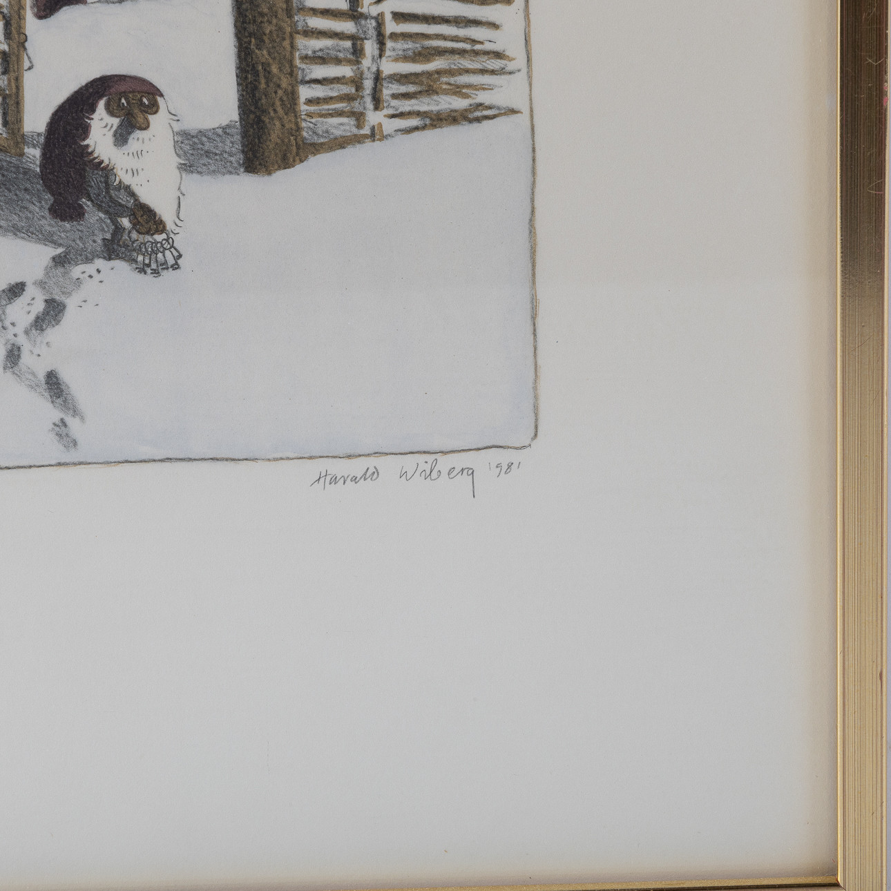 3938901. HARALD WIBERG. Tomte i vinterlandskap, litografi.