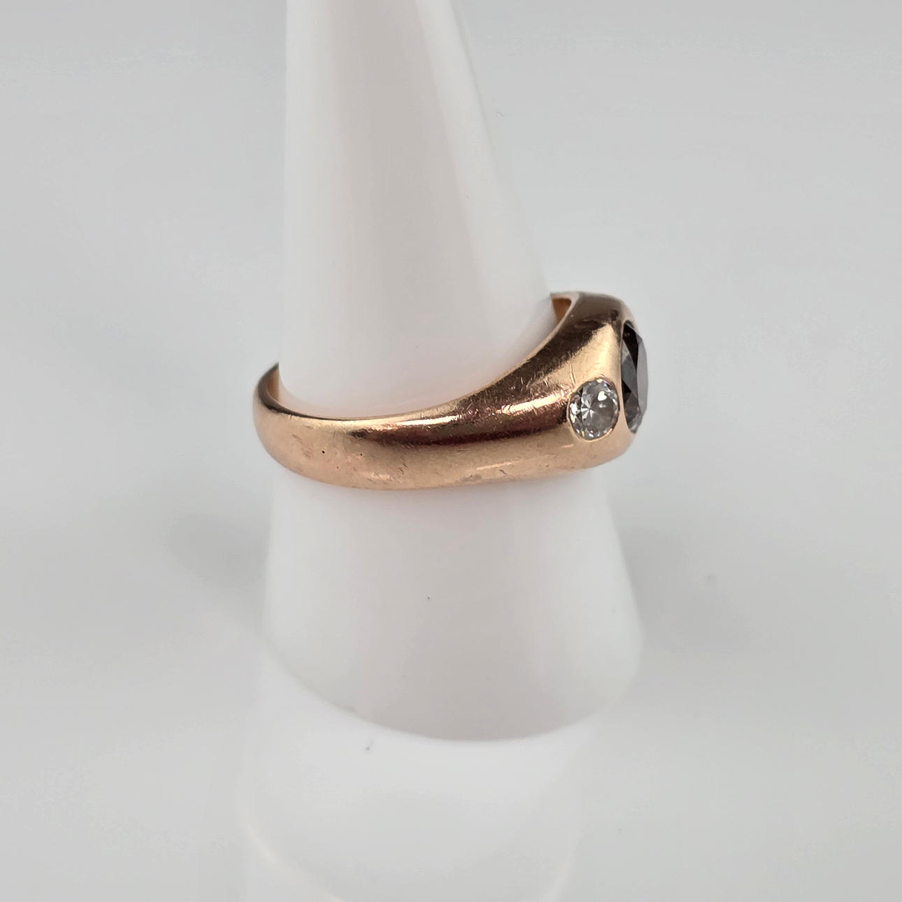 stämplad, centralt inställd med 1 briljantslipad färgad diamant på 1.25 karat. (naturlig färg: cognac fin/renhet: P2) flankerad av 1 fasetterad gammalslipad diamant på totalt 0,40 karat. (färg: G (Top Wesselton) /Klarhet: Vs), bredd ringhuvud 9,5 mm, vikt 7,8 g, ringstorlek 63, bifogad expertrapport december 1997.