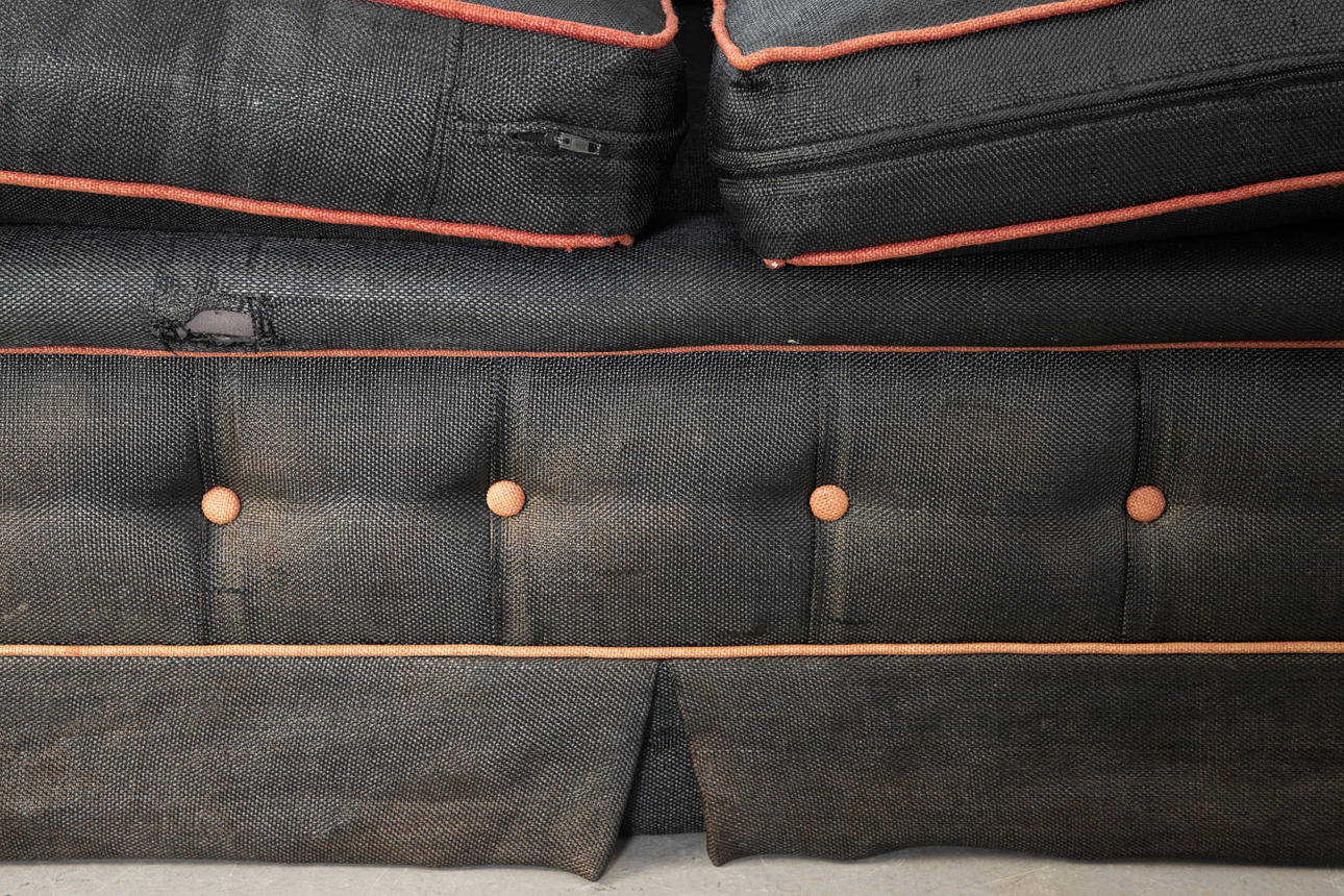 Tecken på slitage, omslaget kan variera i färg på platser. Riv i tyget vid kanten av sätet (i mitten).