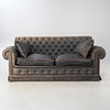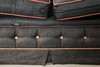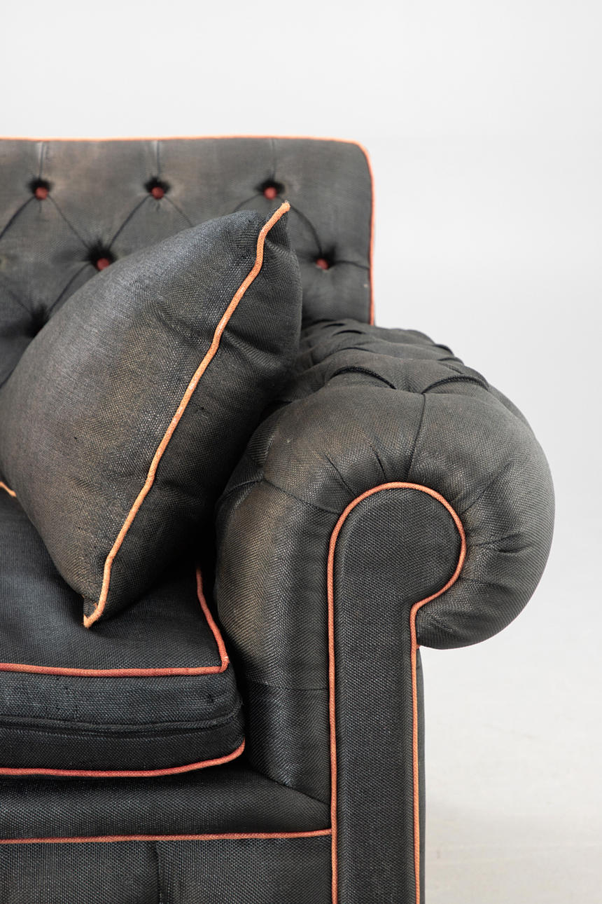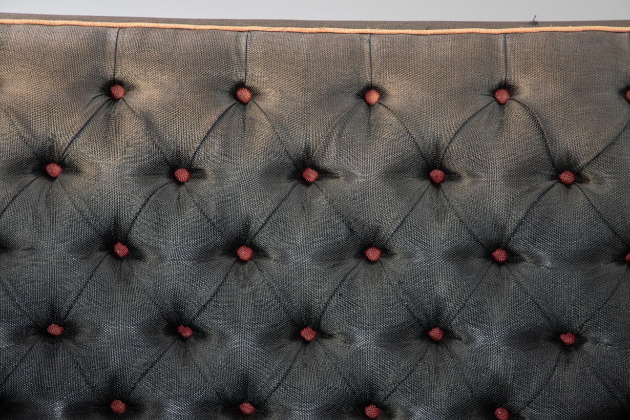 Helstoppad träram med rundade kanter Tuftad ryggstöd och framsida av ramen. På träben. Grovvävt syntetiskt tygöverdrag