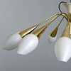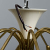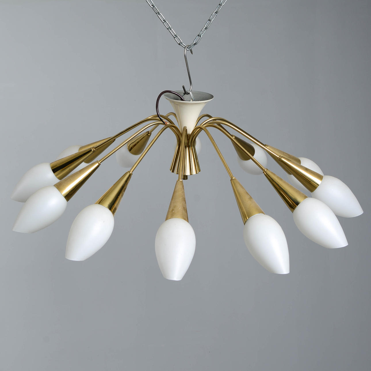 12 ljusarmar i mässing med kupor i frostat glas. Vitlackerad stomme och takkopp.