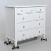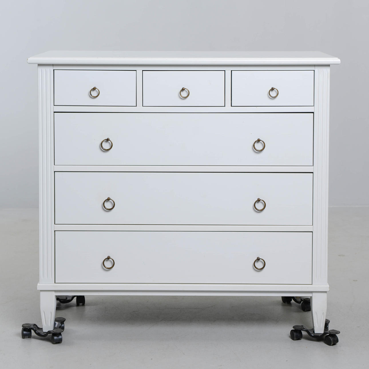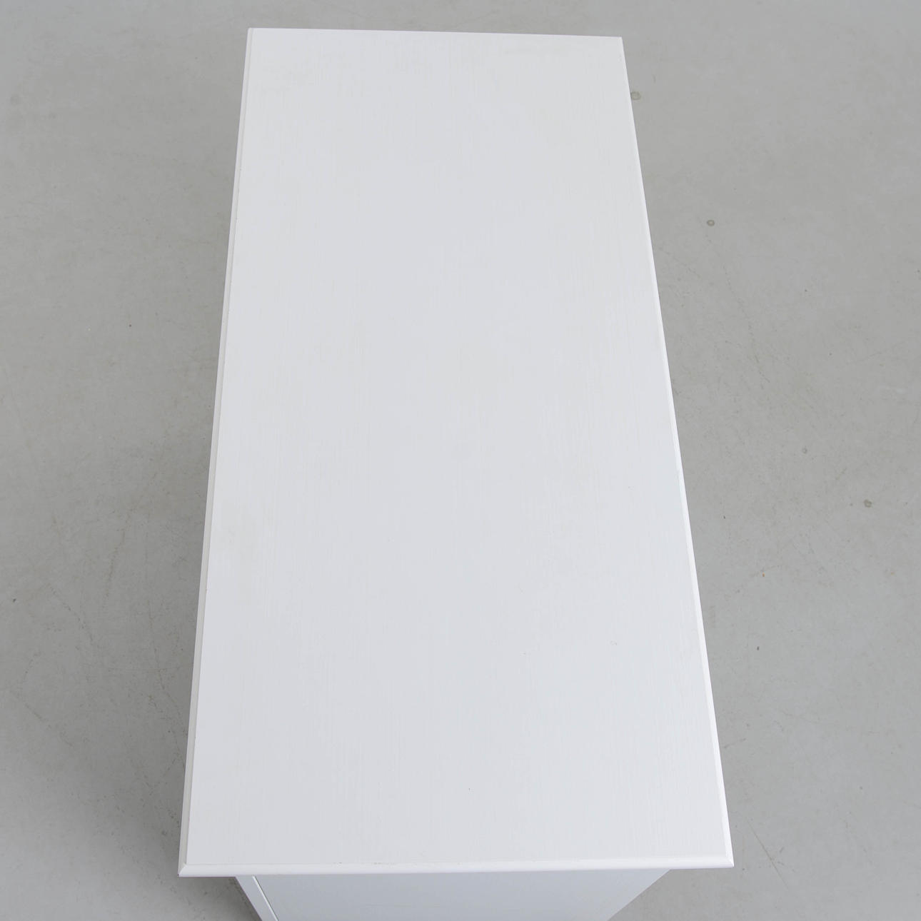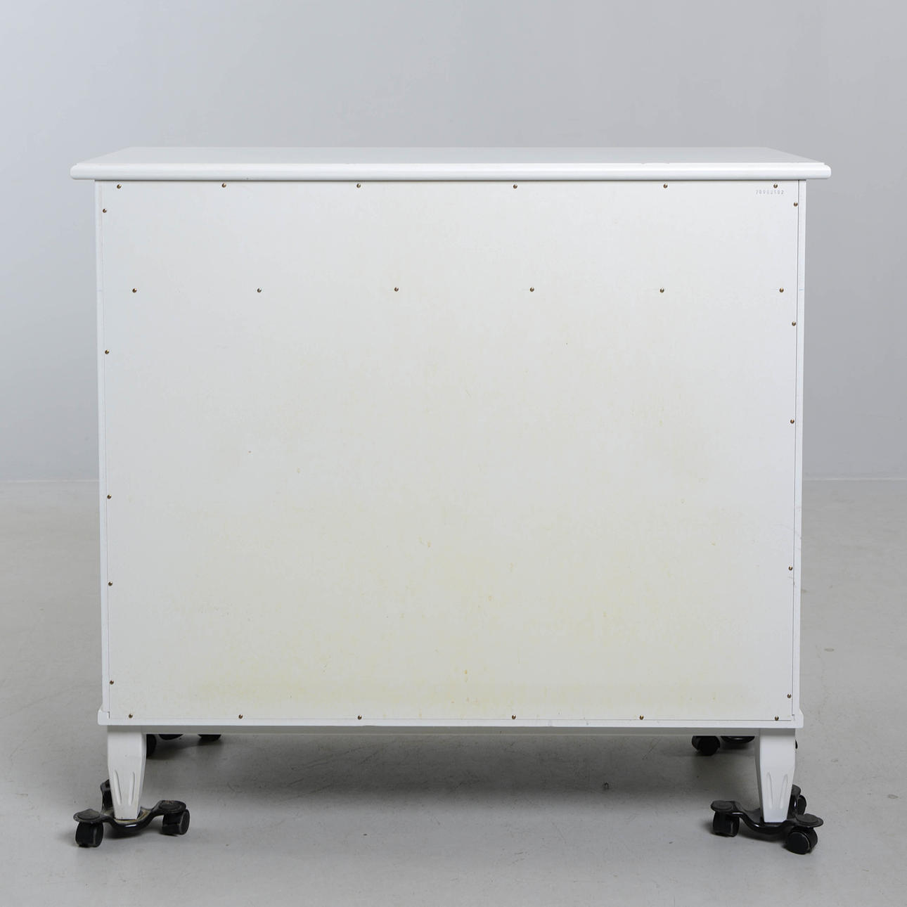 Vitlackerad. 6 lådor, dragringar i metall. Längd 102 cm. Djup 48 cm. Höjd 93 cm.