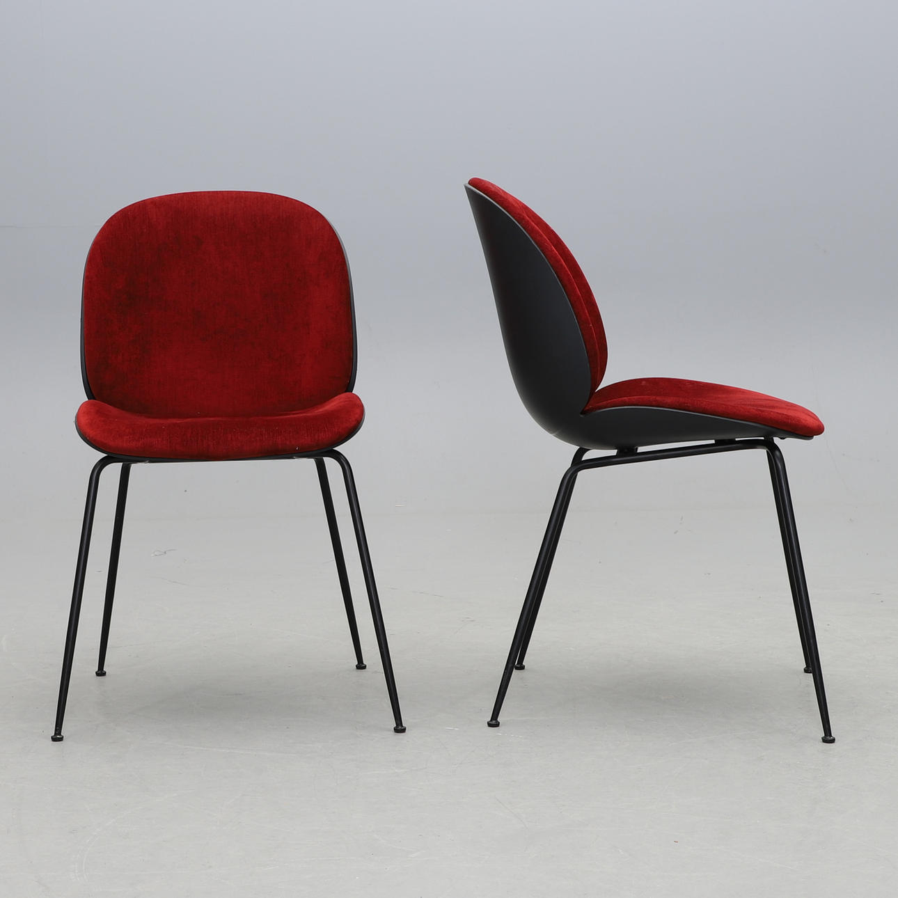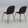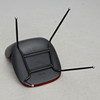 Sits och rygg i formgjuten svart plast och stoppning klädd i roströd plysch. Bredd 49, höjd 87, sitthöjd 48 cm.