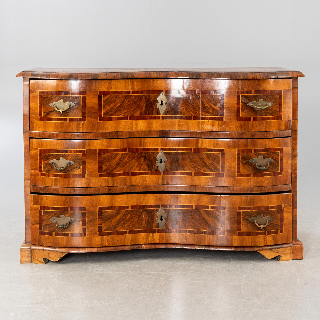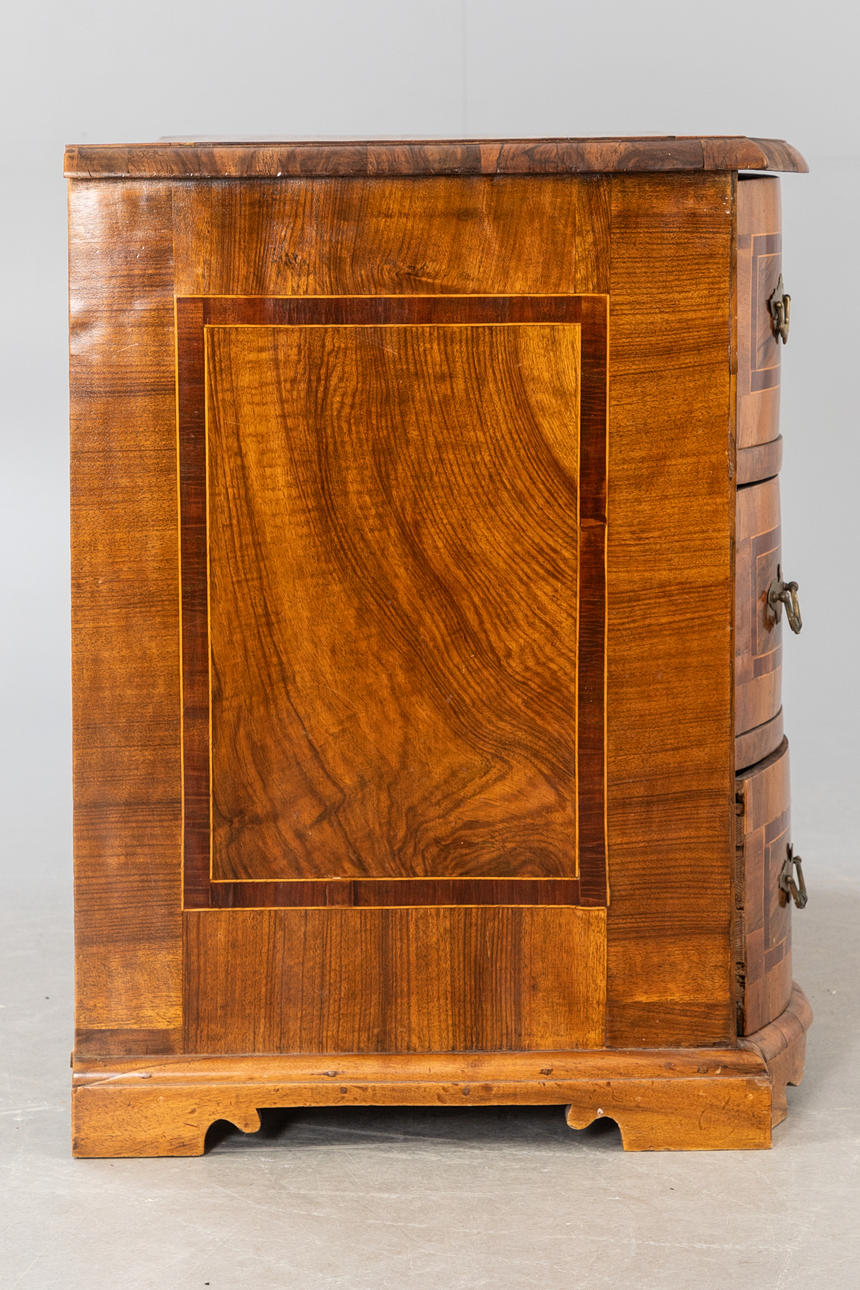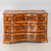 Valnöt, påfåglar och andra träslag fanerade på barrved. Rektangulär kropp på böjda ben skuren ut över hörn. Fristående, smal ram som tar fart på framsidan. De tre lådfronterna är uppdelade med tre fyllningsfält i breda bandramar. Varierande fyllningar på motsvarande täckplatta och sidor. HxBxD: ca. 82 x 122 x 60 cm.