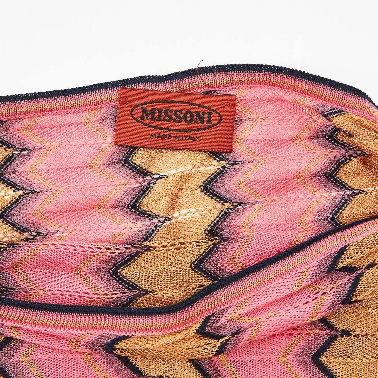 Stickad bomullsmix i rosa, lila och beigt, etikettmärkt "Missoni made in Italy", storlek IT 44, bredd ca 137cm.
