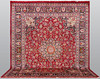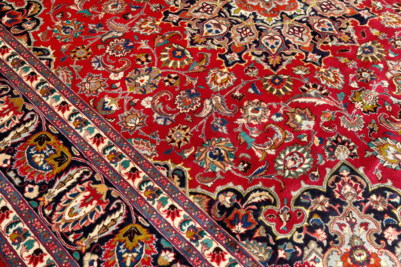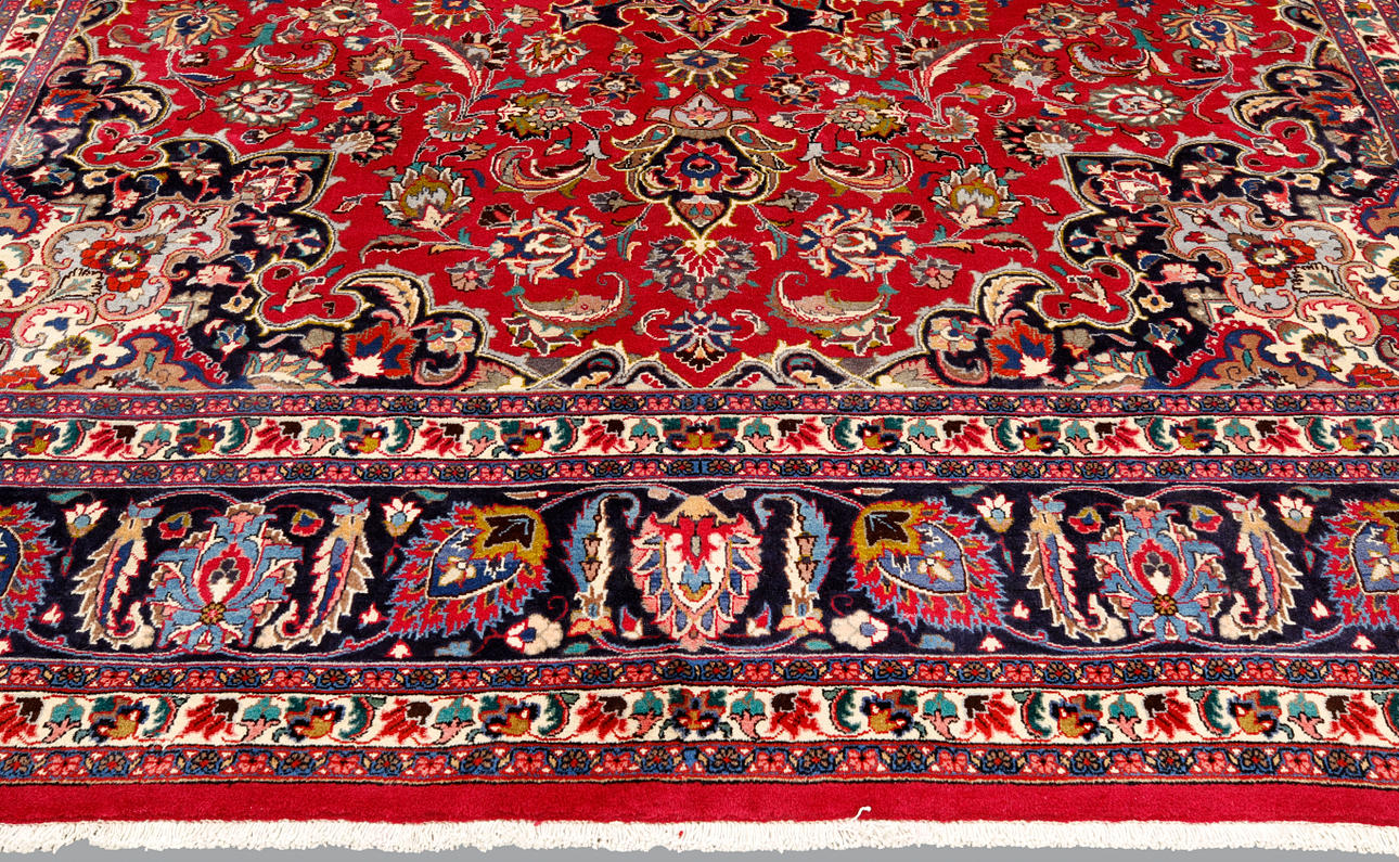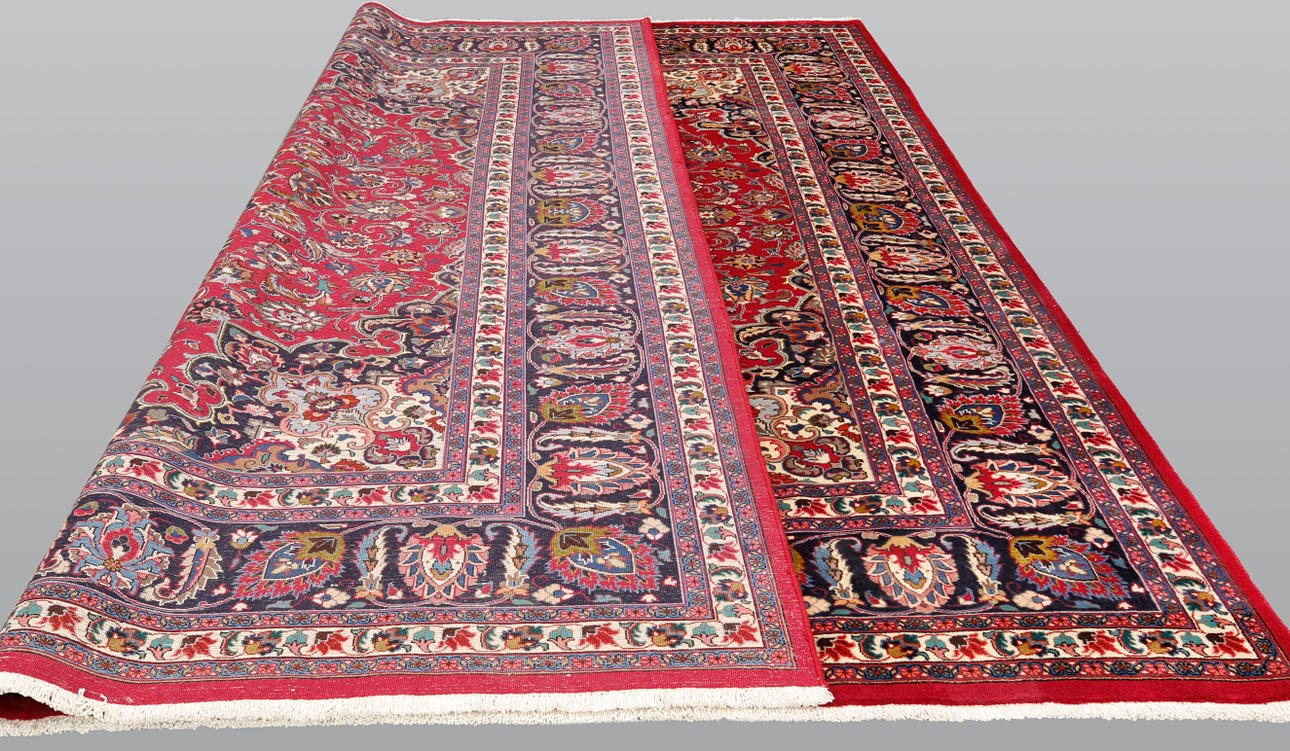 Huvudfält med röd bottenfärg, mittmedaljong, samt hörnornament. Huvudfältet har också dekor av palmett- och arabeskranka. Huvudbård med mörk bottenfärg samt palmett- och arabeskranka.