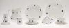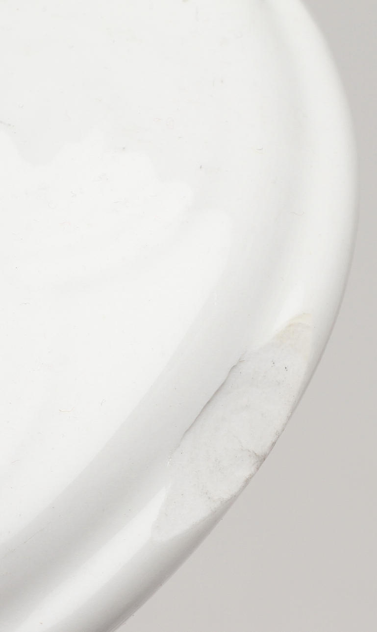 Bruksslitage, en ljusstake med nagg på fot, en tekopp med bottennagg.