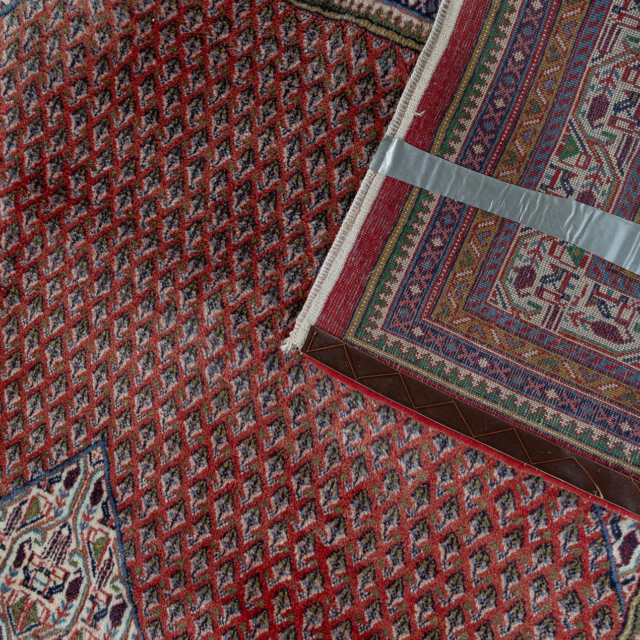 Bruksspår. Dragen, solblekt, smutsig. Fransar saknas.
