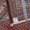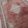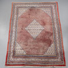 Mått ca 330 x 212 cm. Geometriskt mönster mot röd bakgrund Huvudbård med stiliserad dekor mot ljus botten.