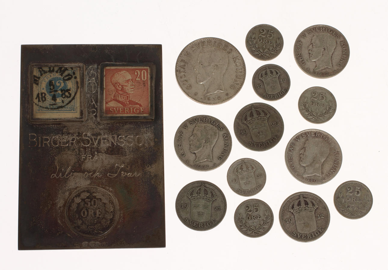Mynt 60 resp. 80 % silver, plakett vikt 75, 80% ca 237 g, 60 % 138 g.