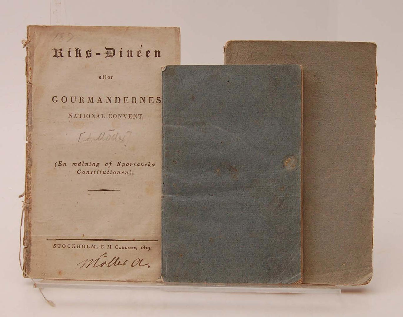 Res-déjeunéen. Uppvärmda idéer från år 1829. Sthlm, C. M. Carlson, 1830. 12:o. (2),II,32 s. Häftad i samtida gråpappersomslag. "Ex Libris Gunnar Mällberg Gunnie".