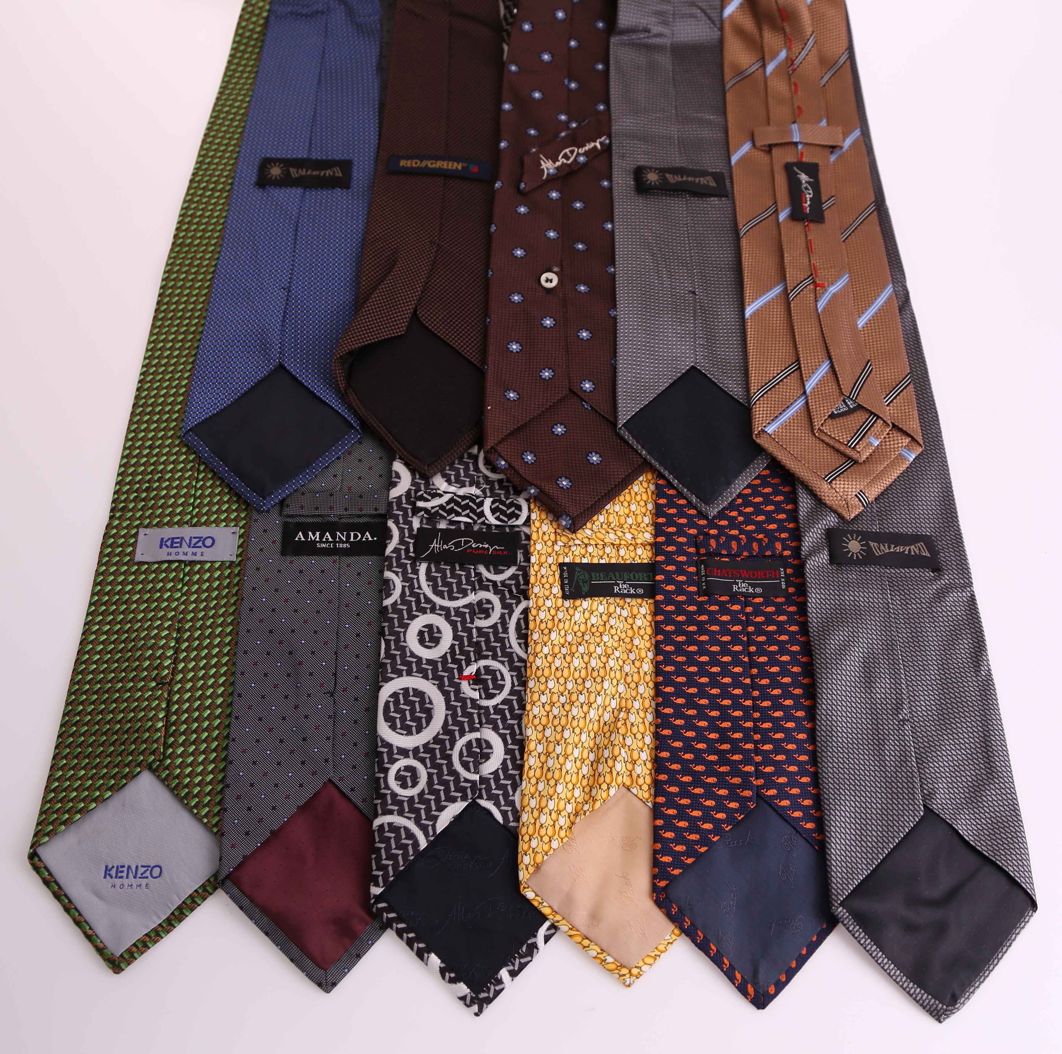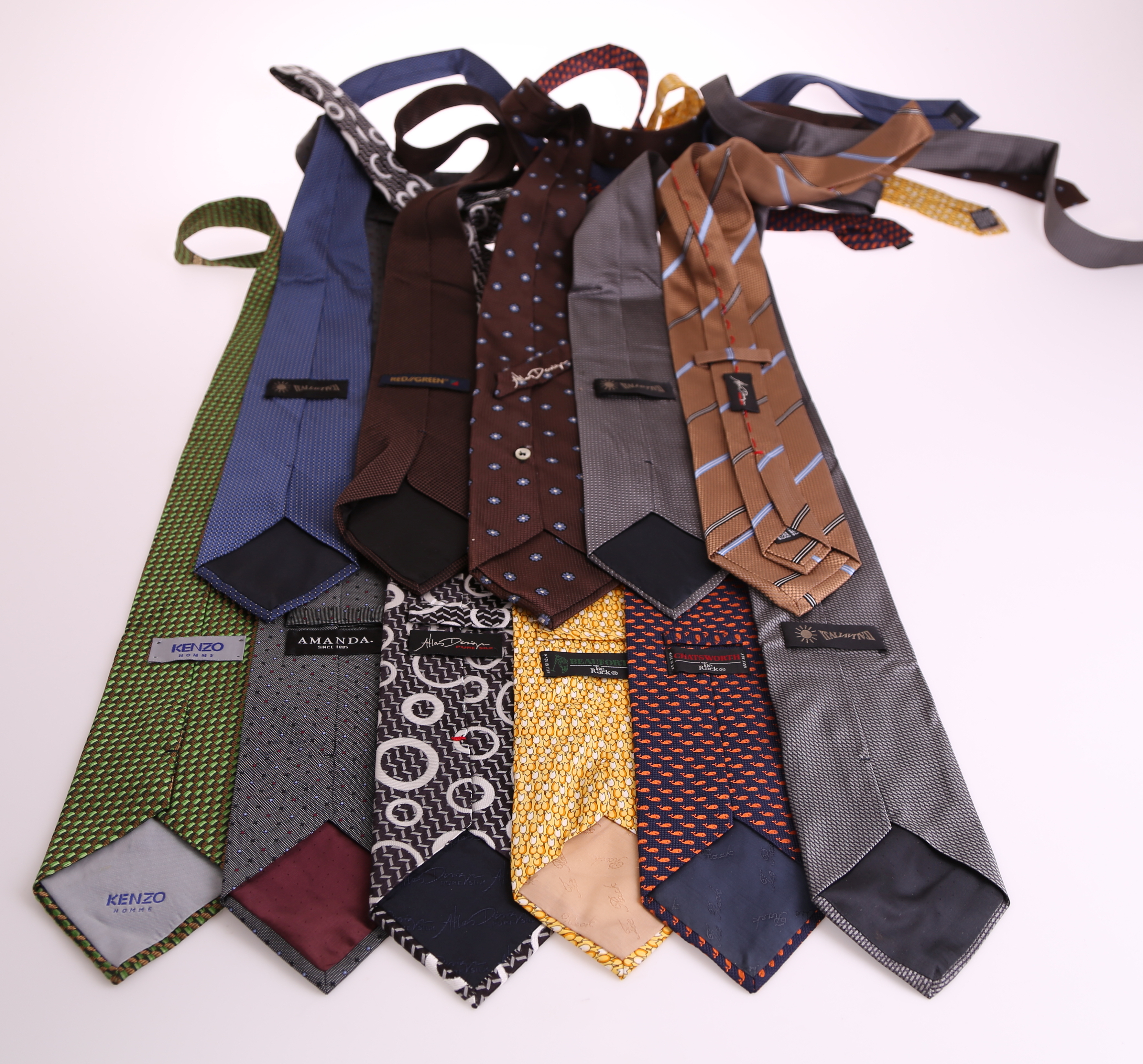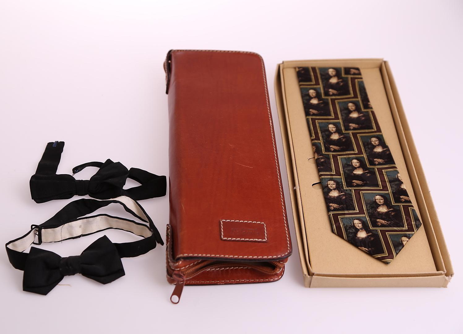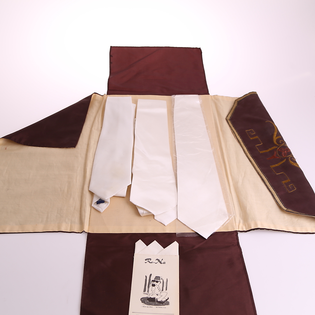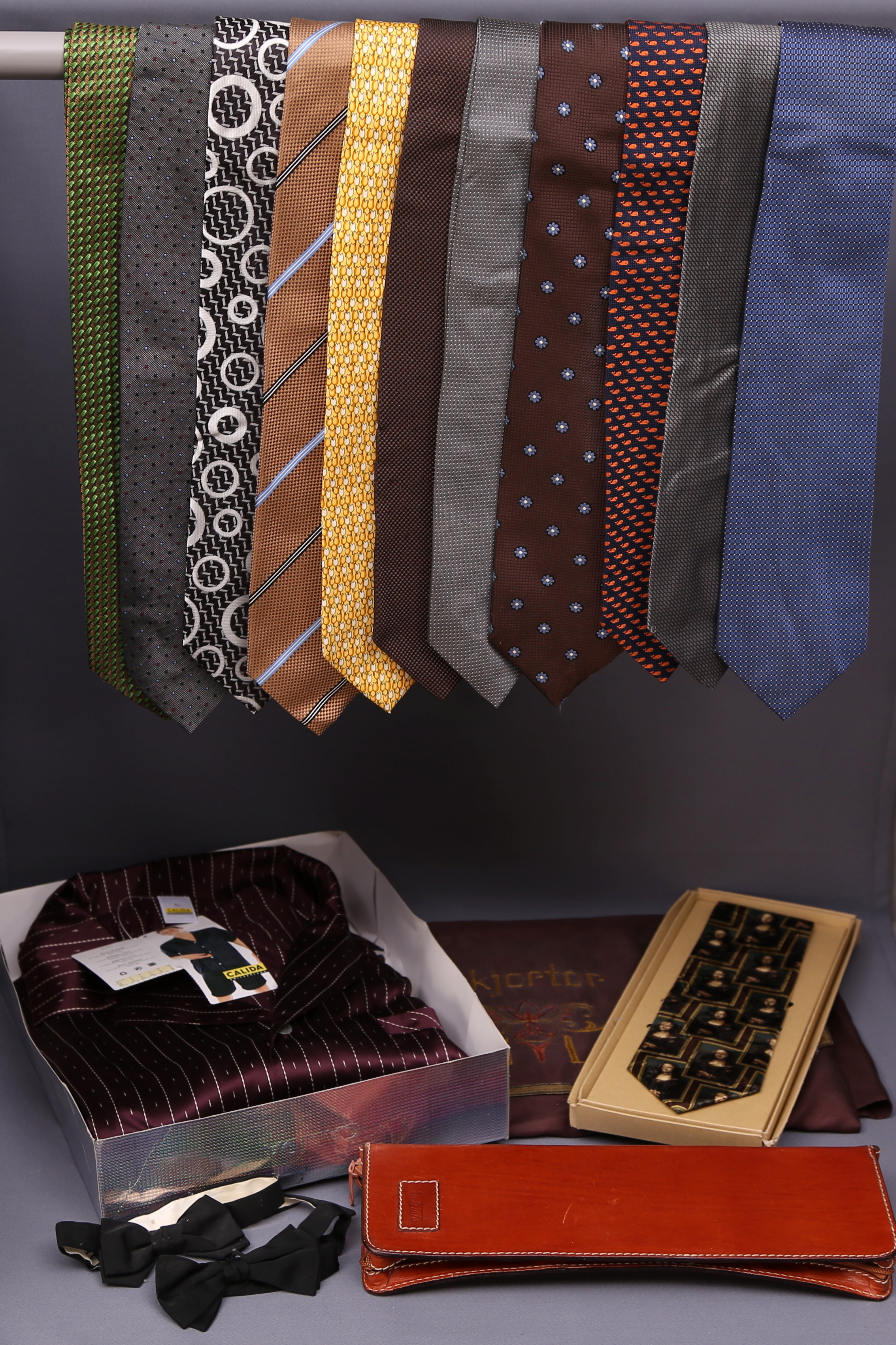 396280. HERRTILLBEHÖR: slipsar, siden + pyjamas + flugor, 1900-tal.