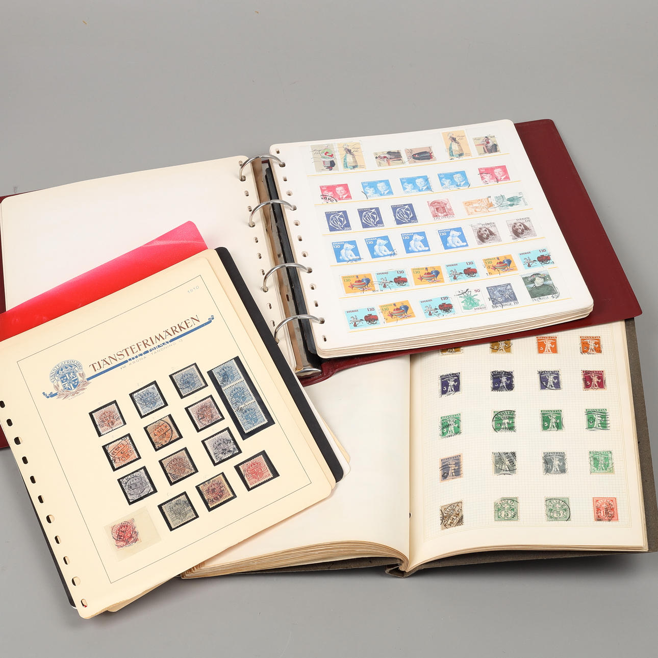 En pärm med stämplade svenska frimärken.