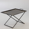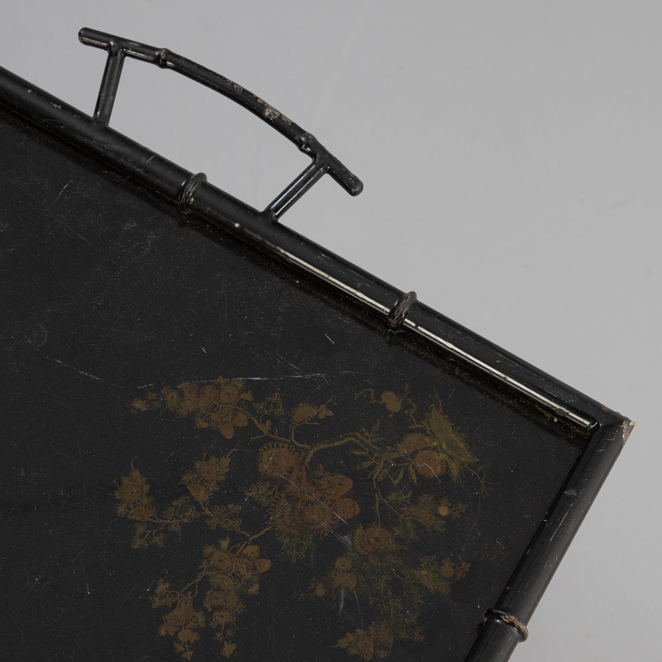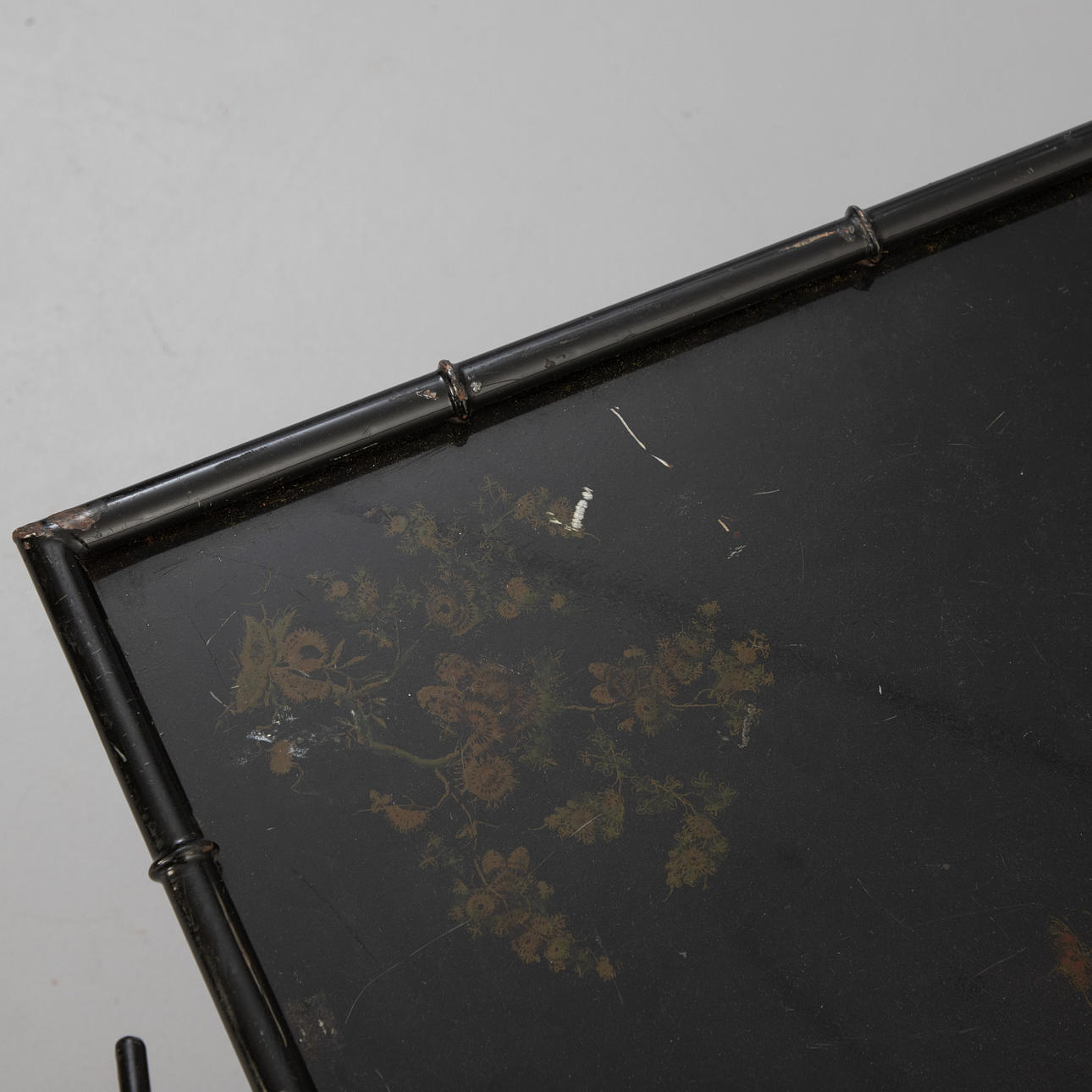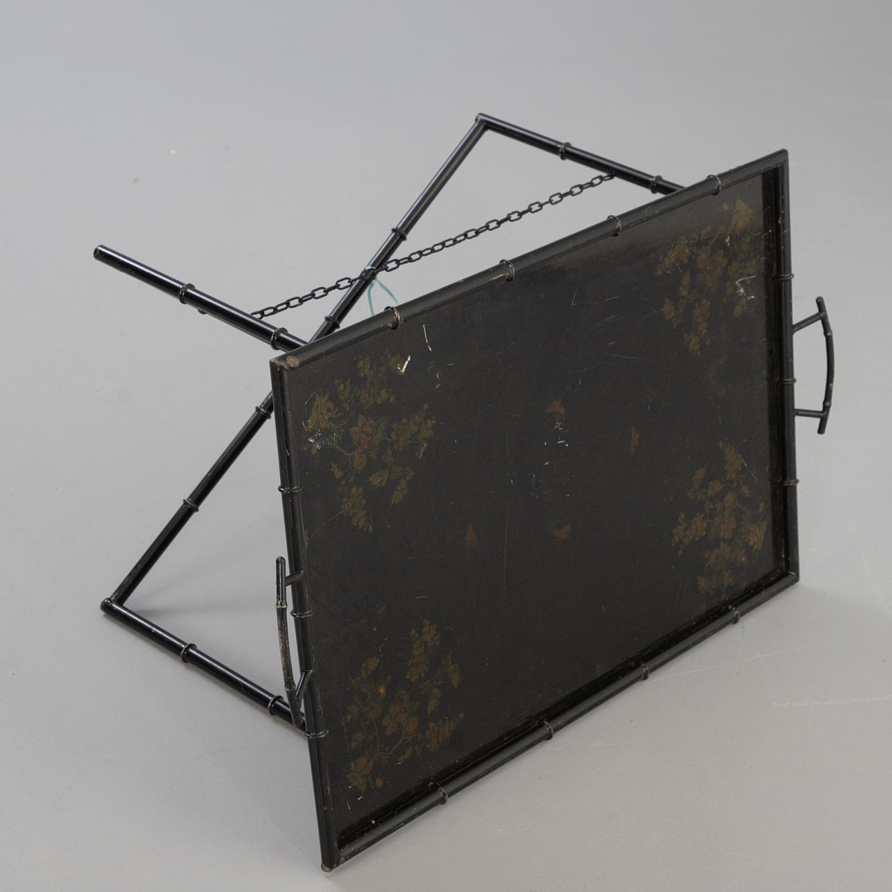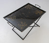 metall, svartmålad. Ram och handtag i bambu-look, vikbara. Lös metallbricka med blommig målning i guld.