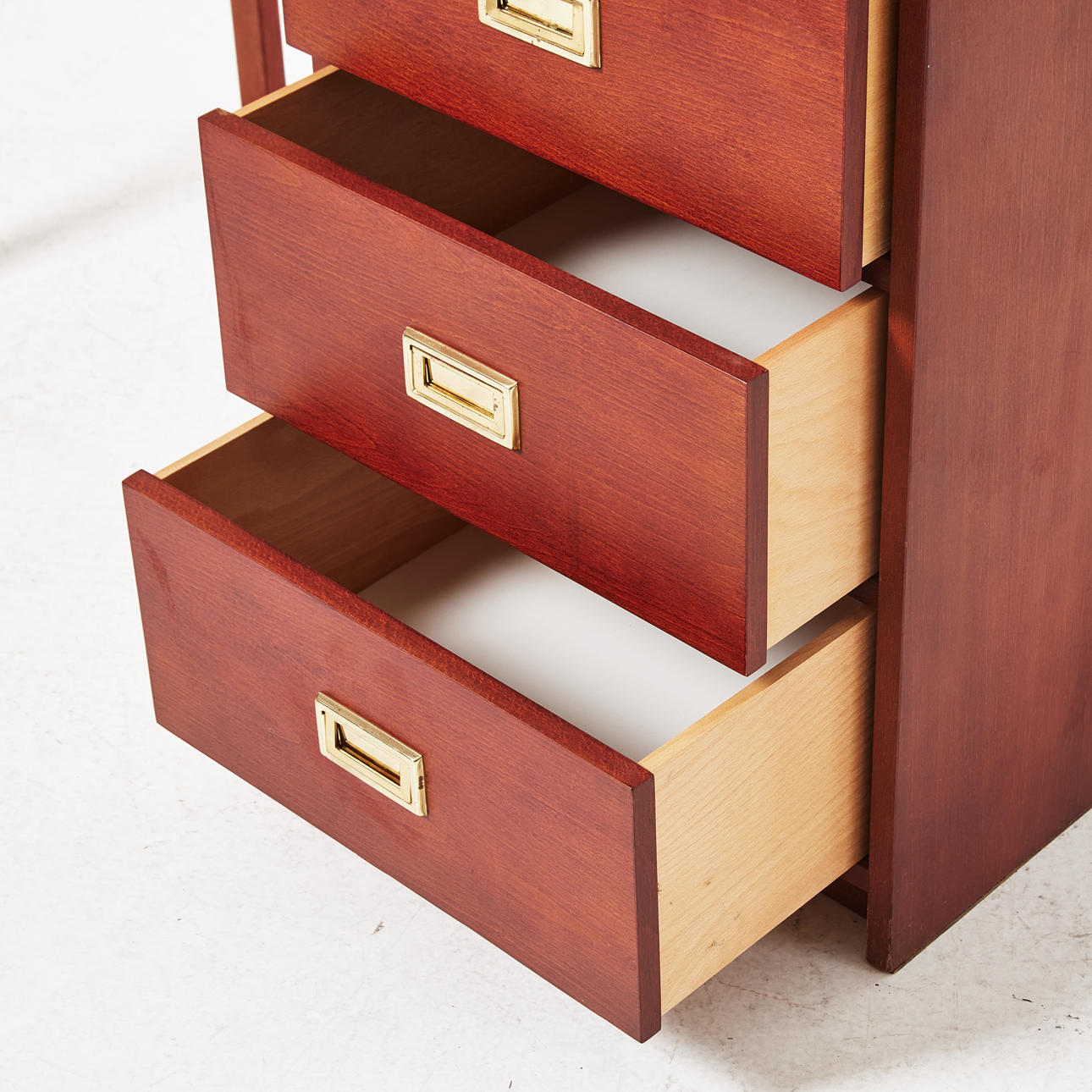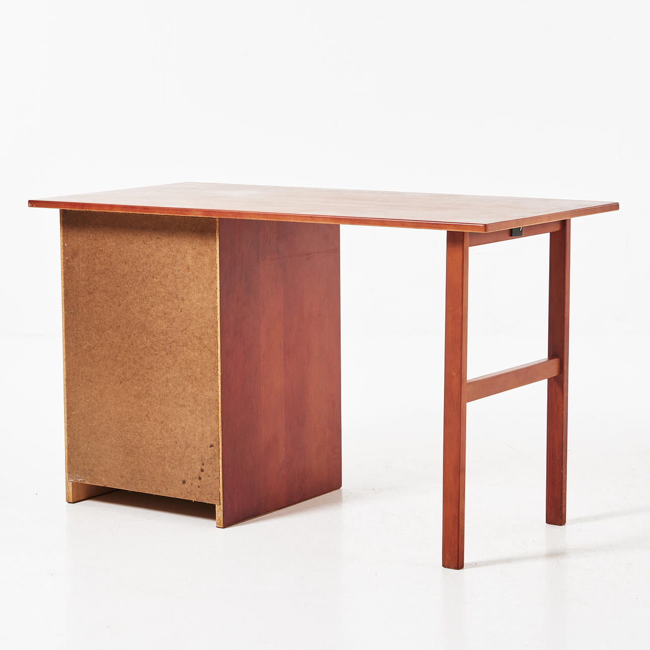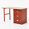Bordsskiva med ben av teakfanér. Hurts med tre lådor, mahgonyfanér och beslag av mässing. Längd 120 cm, bredd 60 cm, höjd ca 73 cm.