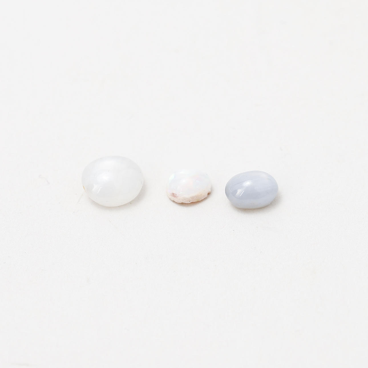 Vit stjärnsafir ca 7,5 x 7 mm, ca 2,60ct. Gråblå stjärnsafir, ca 6,5 x 5 mm, ca 1,60ct. Opal oregelbunden, längd ca 5 mm, ca 0,50ct. Ametist ca 7 x 5,5 mm, ca 0,70ct.
