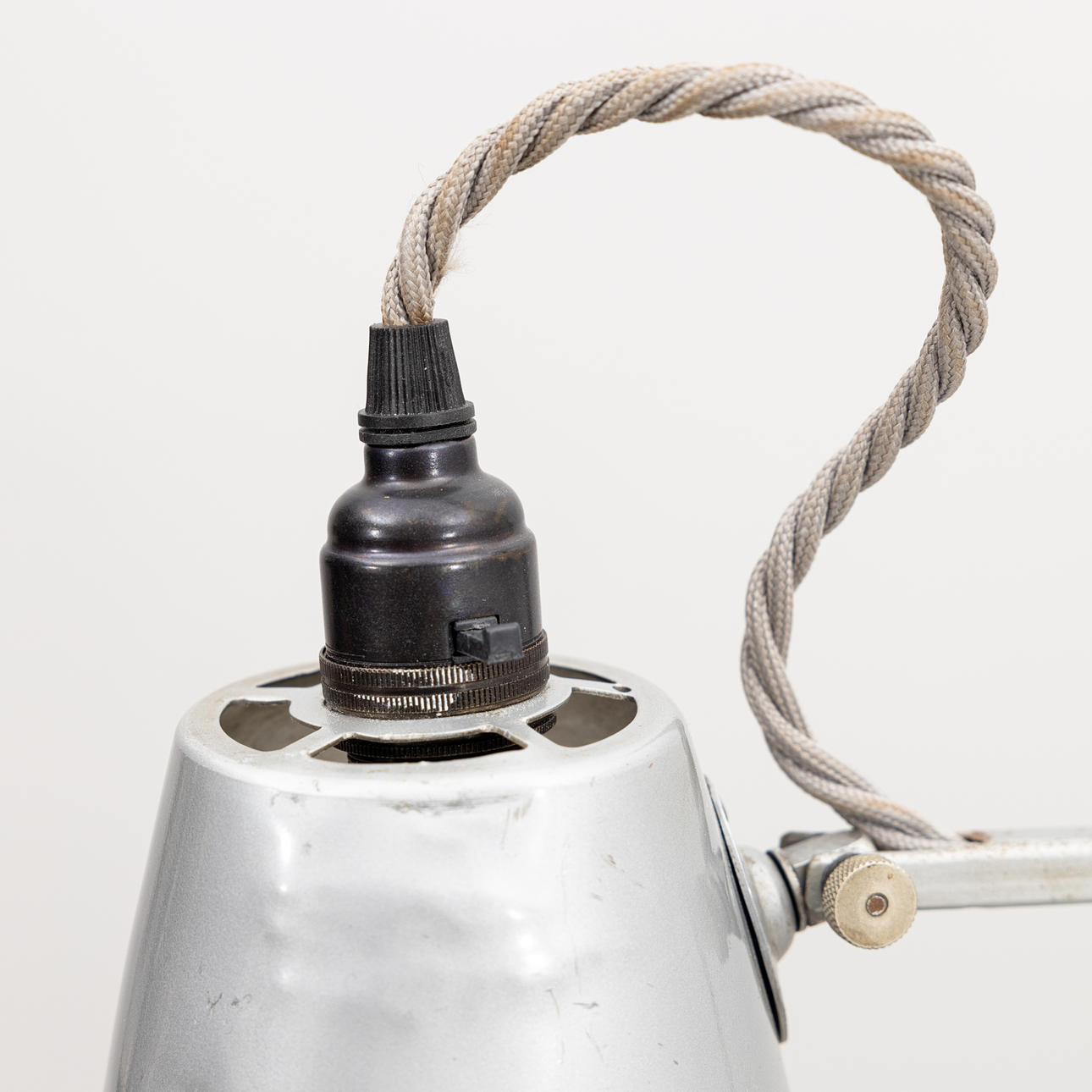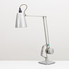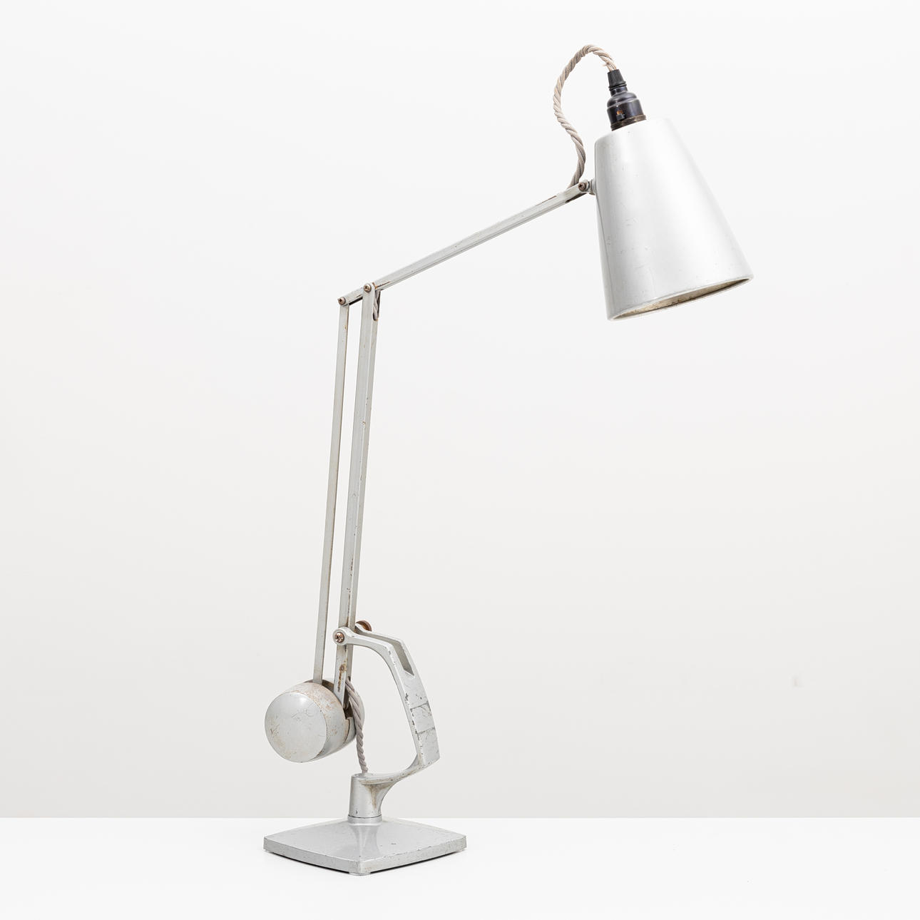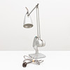 Gråmålad metall. Ledad arm med reglerbar skärm. Höjd ca 60 cm.