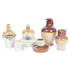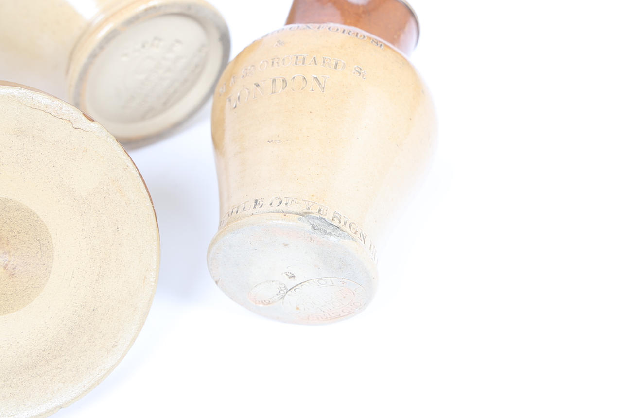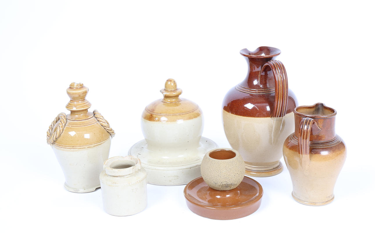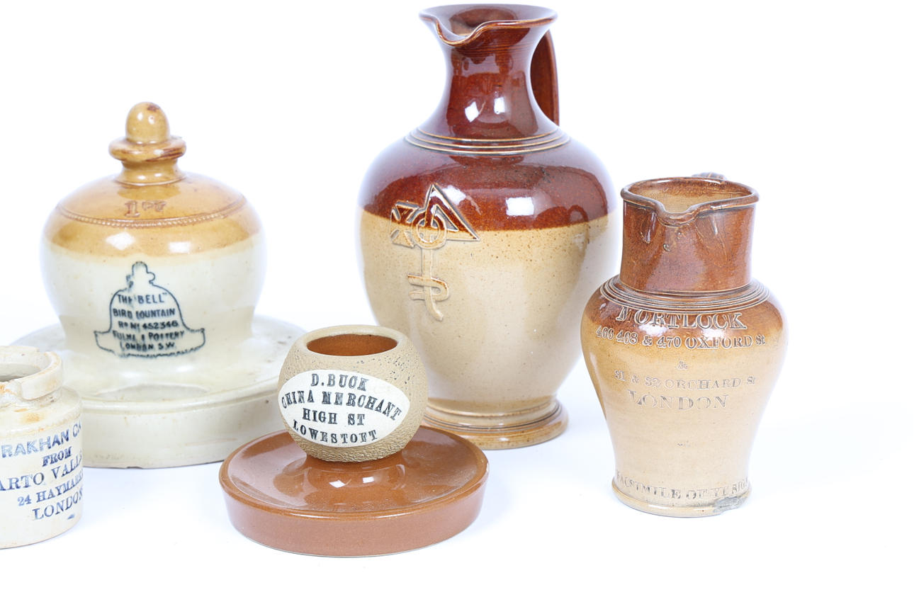 För att inkludera en sparkasse till Eadeth M. Boulton 1894, 16 cm lång, en klockfågelfontän av Fulham keramik, 15 cm, en kanna imponerad Mortlock of London, 13 cm lång, en gälmåttkanna märkt ”Made only for Watson Salisbury” till basen, 19,5 cm lång, en tändstickhållare ”D.Buck China Merchant High ST Lowestoft” och en liten kruka till 'Astrakhan Caviare From Barakhan Caviare Valle & Co., 24 Haymarket, London ', (6).