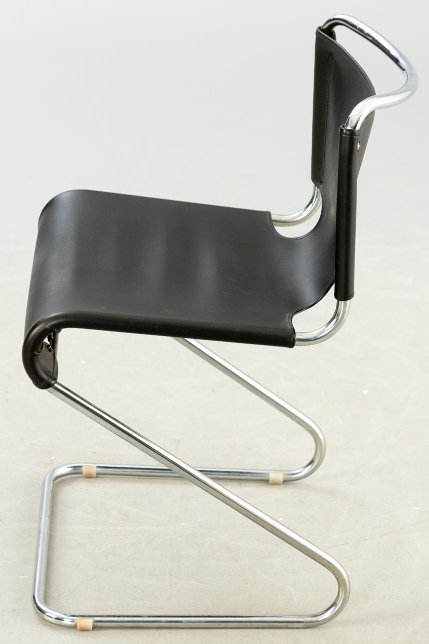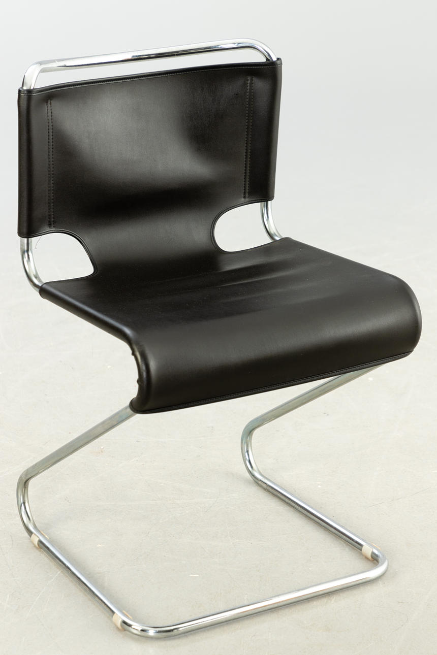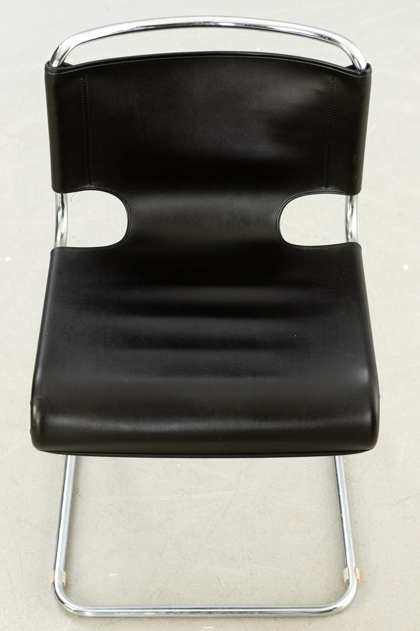 Förkromat stålrör och läder ca H 75 cm, B 44,5 cm, D 44 cm, Sh 45,5 cm.