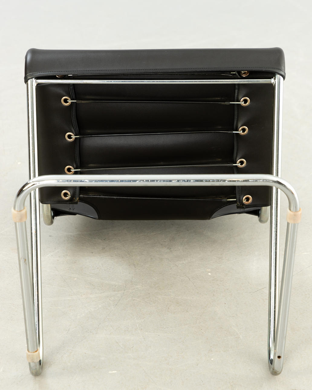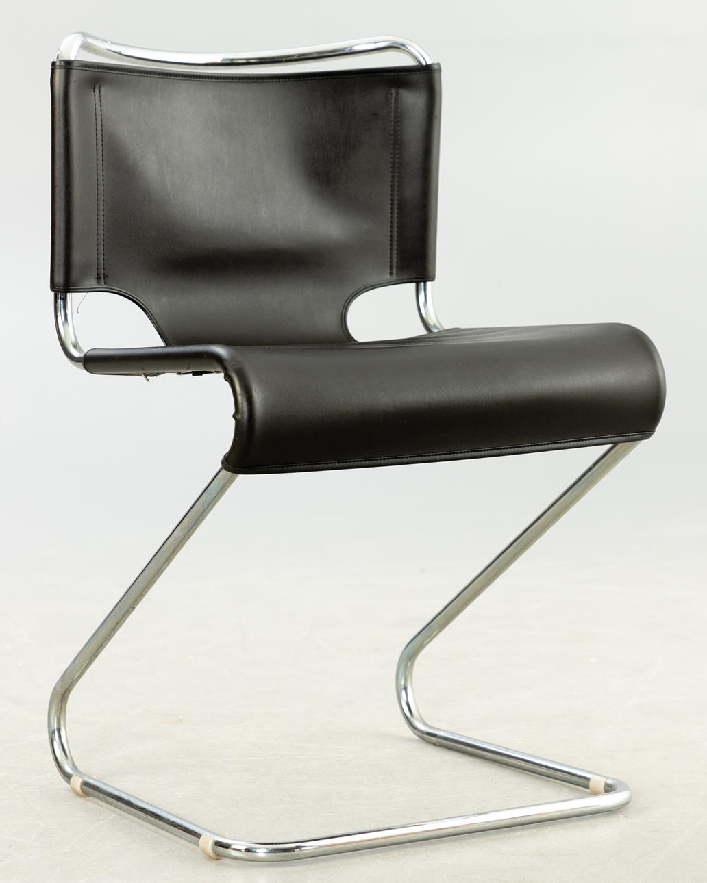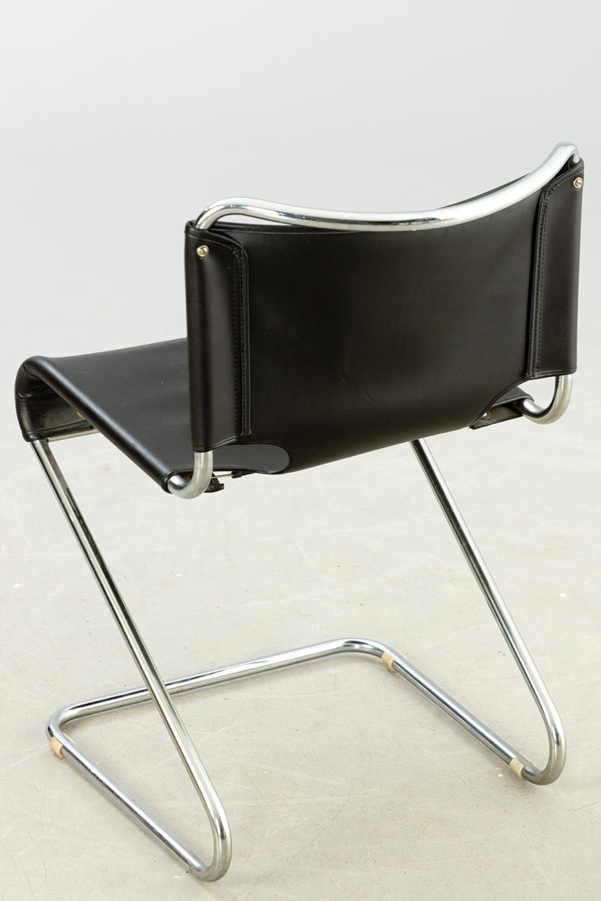 Förkromat stålrör och läder ca H 75 cm, B 44,5 cm, D 44 cm, Sh 45,5 cm.