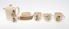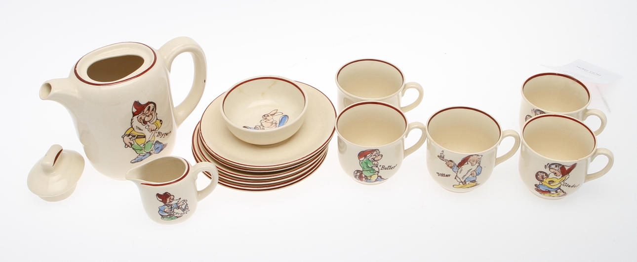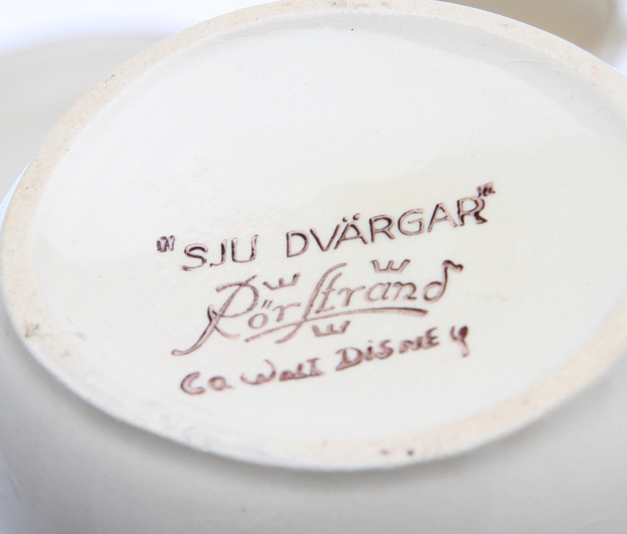 Dekor av tomtar. 5 koppar med fat, 2 kannor samt 1 skål.